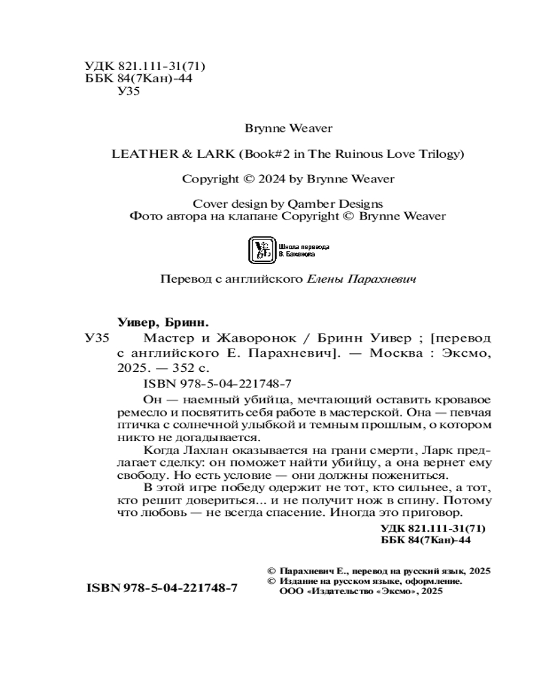 💳 Оплатить за товар можно при получении 🇰🇿 Есть бесплатная доставка по Казахстану от 1 дня 🎁 Копите бонусы с каждой покупки Серия: Cupcake. Бестселлеры Буктока. Бринн Уивер Он — наемный убийца, мечтающий оставить кровавое ремесло и посвятить себя работе в мастерской. Она — певчая птичка с солнечной улыбкой и темным прошлым, о котором никто не догадывается. Когда Лахлан оказывается на грани смерти, Ларк предлагает сделку: он поможет найти убийцу, а она вернет ему свободу. Но есть условие — они должны пожениться. В этой игре победу одержит не тот, кто сильнее, а тот, кто решит довериться... и не получит нож в спину. Потому что любовь — не всегда спасение. Иногда это приговор. |