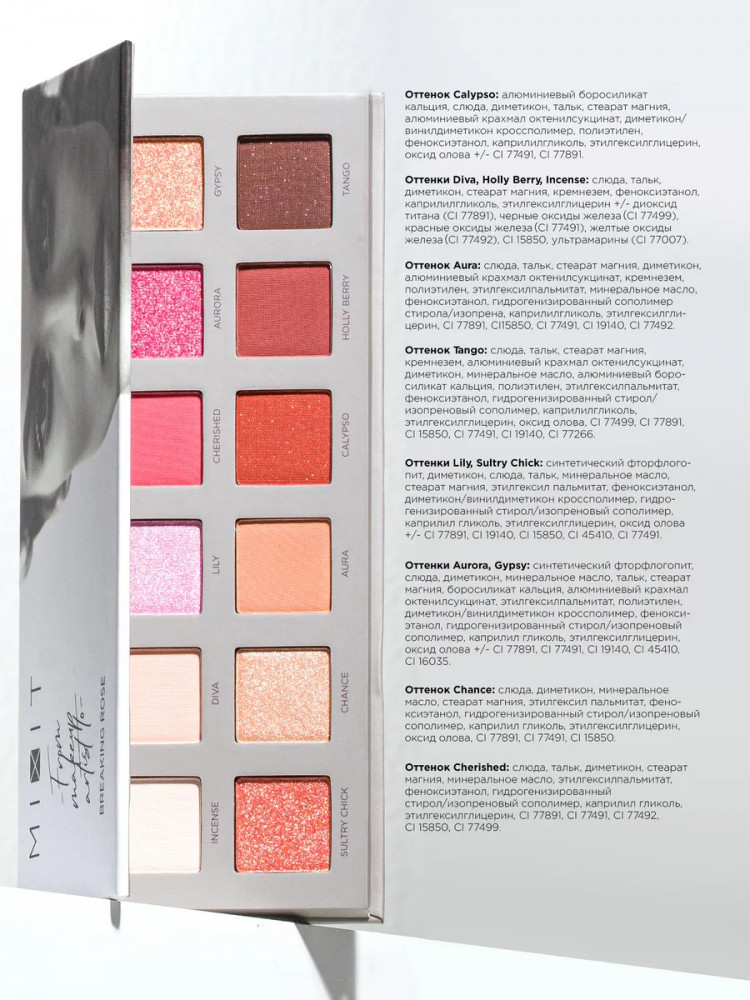 Оттенки Aurora, Gypsy: синтетический фторфлогопит, слюда, диметикон, минеральное масло, тальк, стеарат магния, боросиликат кальция, алюминиевый крахмал октенилсукцинат, этилгексилпальмитат, полиэтилен, диметикон/винилдиметикон кроссполимер, феноксиэтанол, гидрогенизированный стирол/изопреновый сополимер, каприлил гликоль, этилгексилглицерин, оксид олова +/- CI 77891, CI 77491, CI 19140, CI 45410, CI 16035.