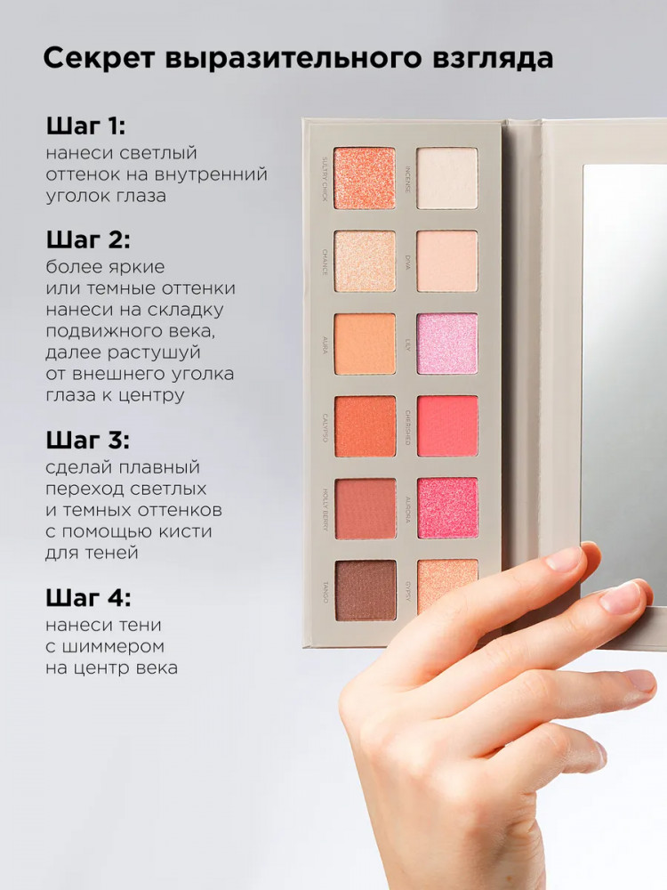 Оттенки Diva, Holly Berry, Incense: слюда, тальк, диметикон, стеарат магния, кремнезем, феноксиэтанол, каприлилгликоль, этилгексилглицерин +/- диоксид титана (CI 77891), черные оксиды железа(CI 77499), красные оксиды железа(CI 77491), желтые оксиды железа(CI 77492), CI 15850, ультрамарины (CI 77007).
