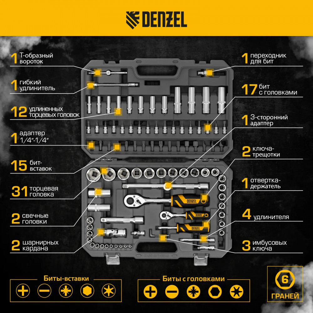 💳 Оплатить за товар можно при получении 🇰🇿 Есть бесплатная доставка по Казахстану от 1 дня 🎁 Копите бонусы с каждой покупки Набор инструментов Denzel 15813 состоит из 94 предметов с присоединительными квадратами 1/4″, 1/2″, упакованных во вместительный ударопрочный кейс собственной разработки с антивандальным покрытием. В комплект поставки входят инструменты и оснастка для монтажа и демонтажа резьбовых соединений. Набор предназначен для профессионального использования в автомастерской, будет полезен и для решения бытовых вопросов. |