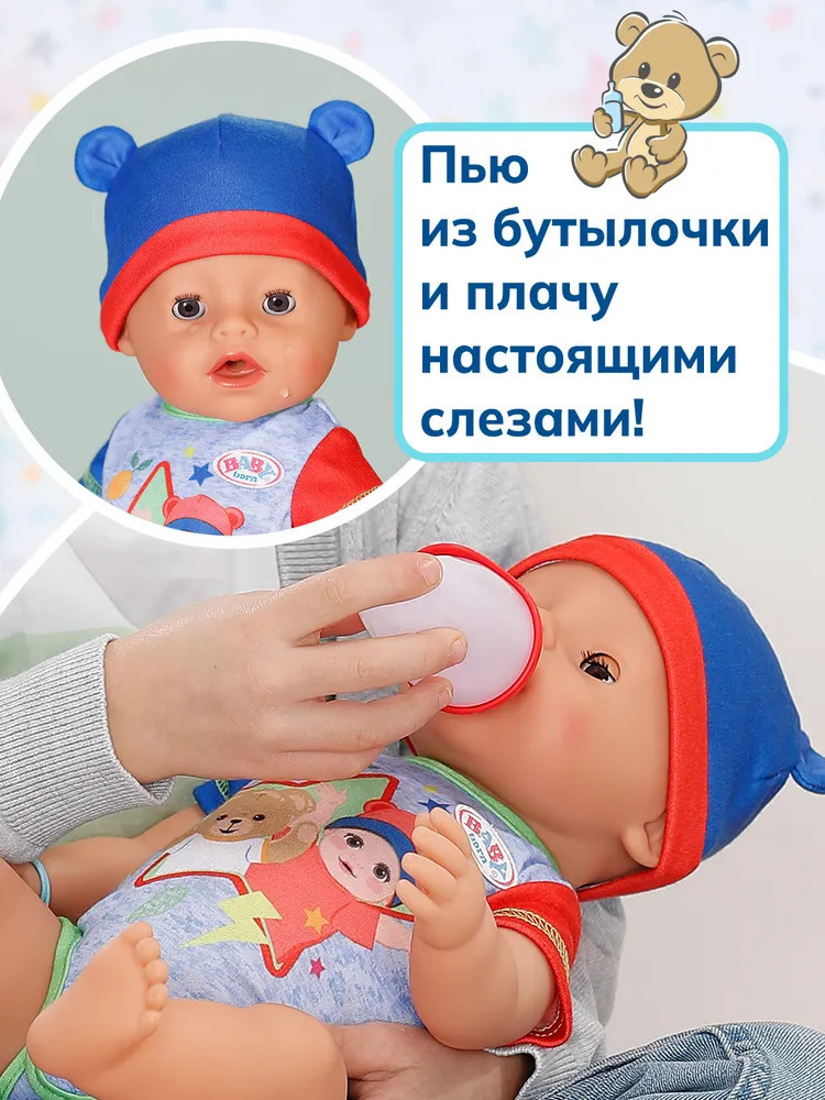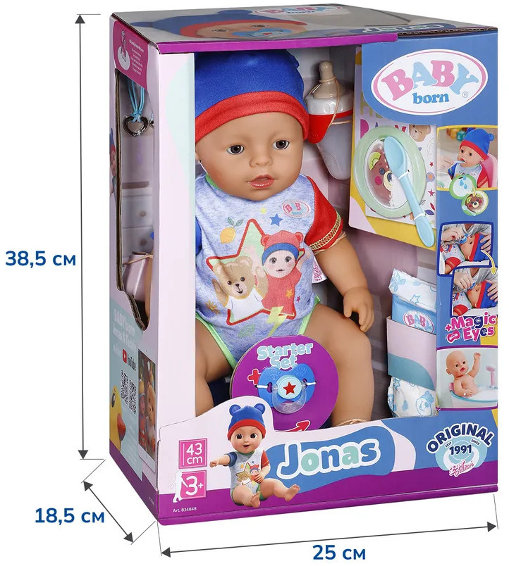 Познакомьтесь с куклой Беби Борн Джонас Магические глазки 43 см! На улице еще светло и Джонас никак не хочет спать? Просто поверни пустышку во рту, и глазки закроются, в каком бы положении ни находился малыш. У куклы 10 интерактивных функций: закрывает глаза, если повернуть во рту куклы соску, спит с закрытыми глазами, умеет пить из бутылочки, плачет настоящими слезами, писает в подгузник и в горшок, умеет есть с ложечки, можно купать, суперподвижная, быстрее сохнет.