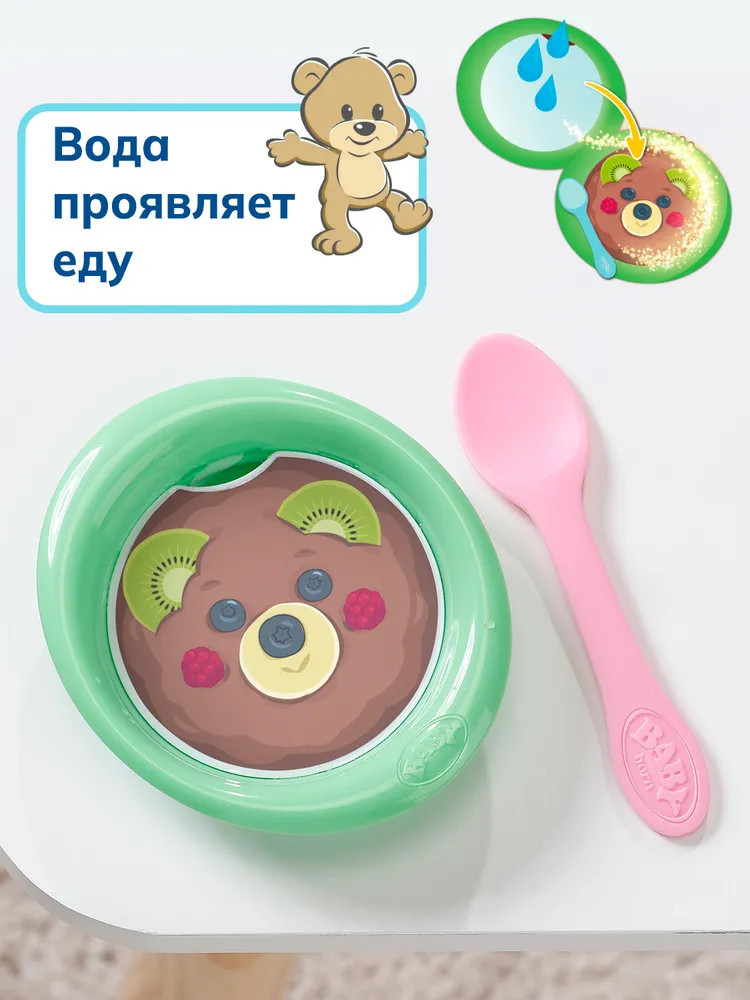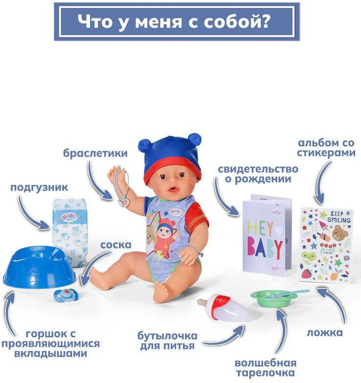 В комплекте 10 аксессуаров: свидетельство о рождении, бутылочка для питья, подгузник, соска, тарелка, ложка, горшок, альбом со стикерами, 2 браслета, инструкция.