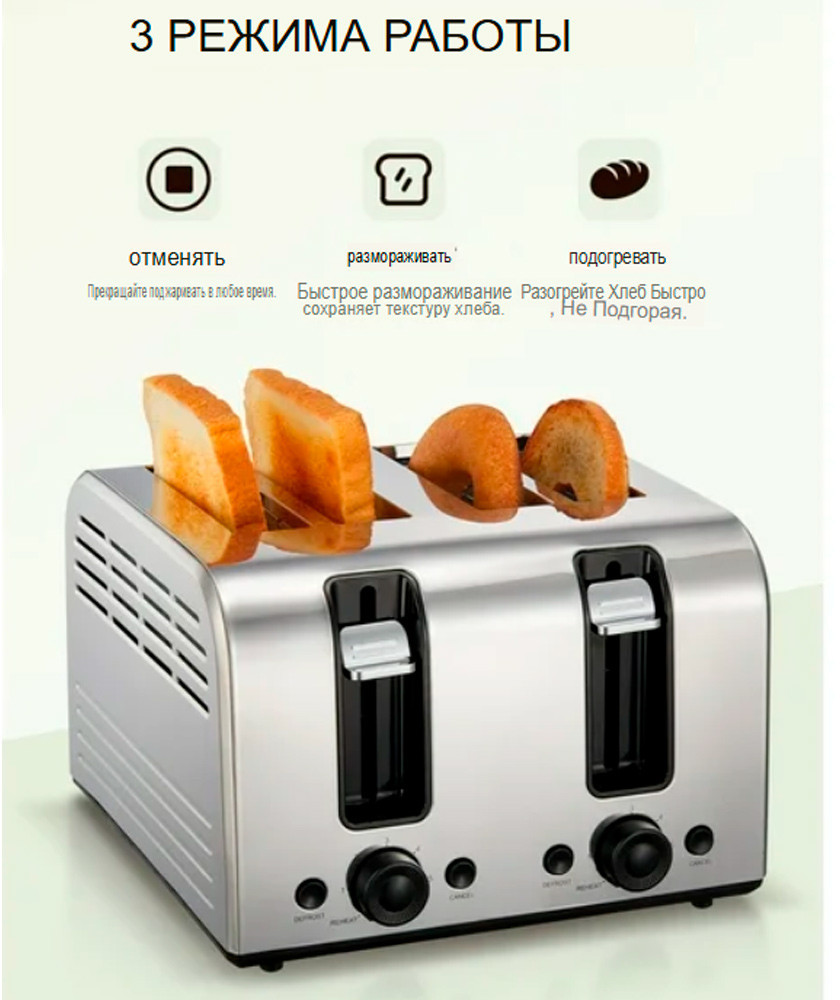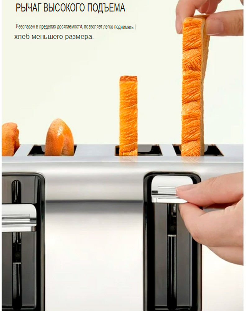 Для более длительного размораживания замороженного хлеба и получения стабильных результатов. Функция «Подогрев» позволяет разогреть тосты, не допуская их подрумянивания. Кнопка «Отмена» позволяет в любой момент остановить поджаривание. Ширина каждого отделения составляет 3,5 см, что позволяет этому тостеру на 4 ломтика хлеба помещать длинные и толстые ломтики домашнего хлеба, техасские тосты, бейглы, английские маффины и многое другое. Благодаря сверхвысокому подъёму вы можете вручную поднять рычаг после того, как хлеб выскочит, не боясь обжечься, и легко вынимать небольшие кусочки.