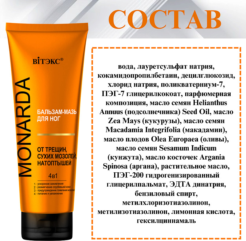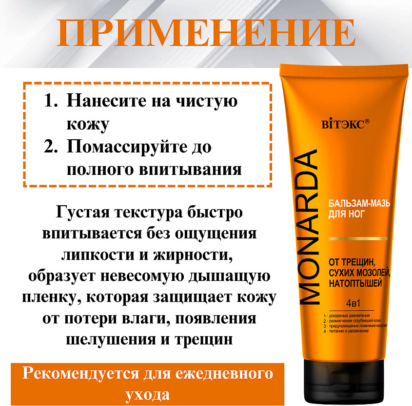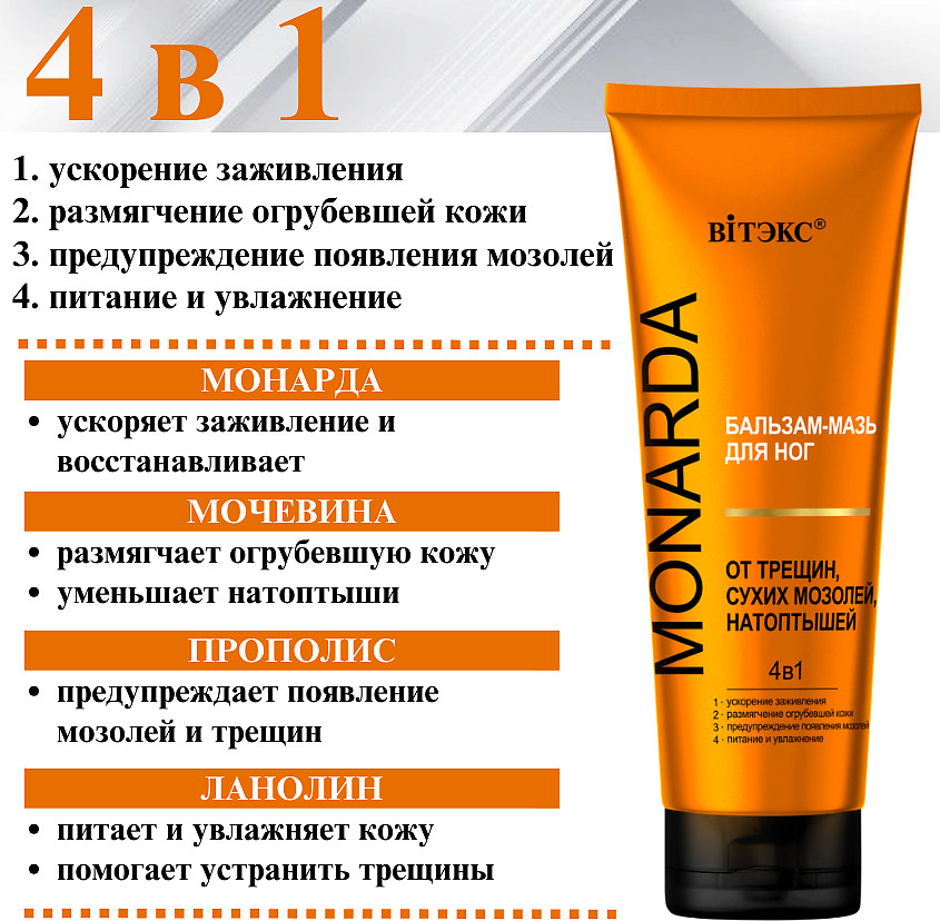 Вiтэкс Бальзам-мазь для ног от трещин, сухих мозолей, натоптышей с целебным экстрактом монарды «4 в 1»