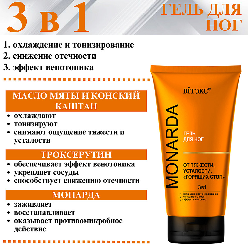 Вiтэкс Гель для ног от тяжести, усталости, «горящих стоп» «3 в 1»