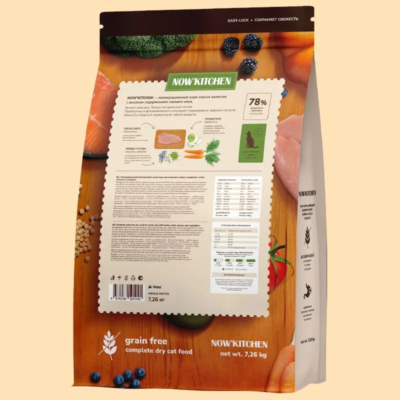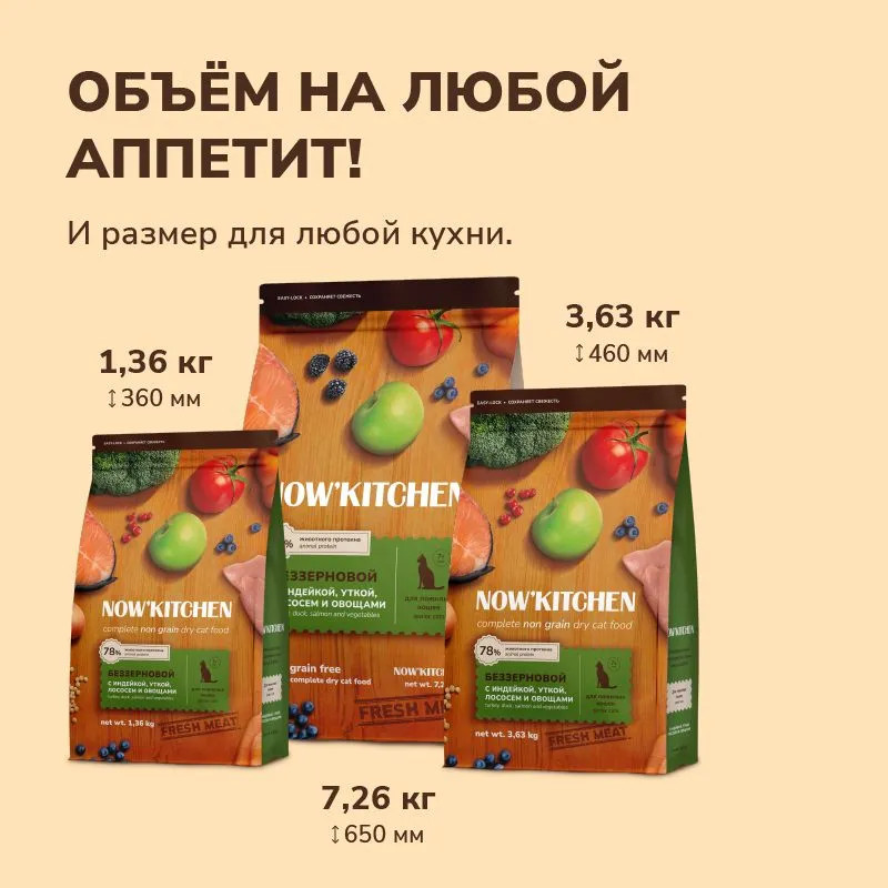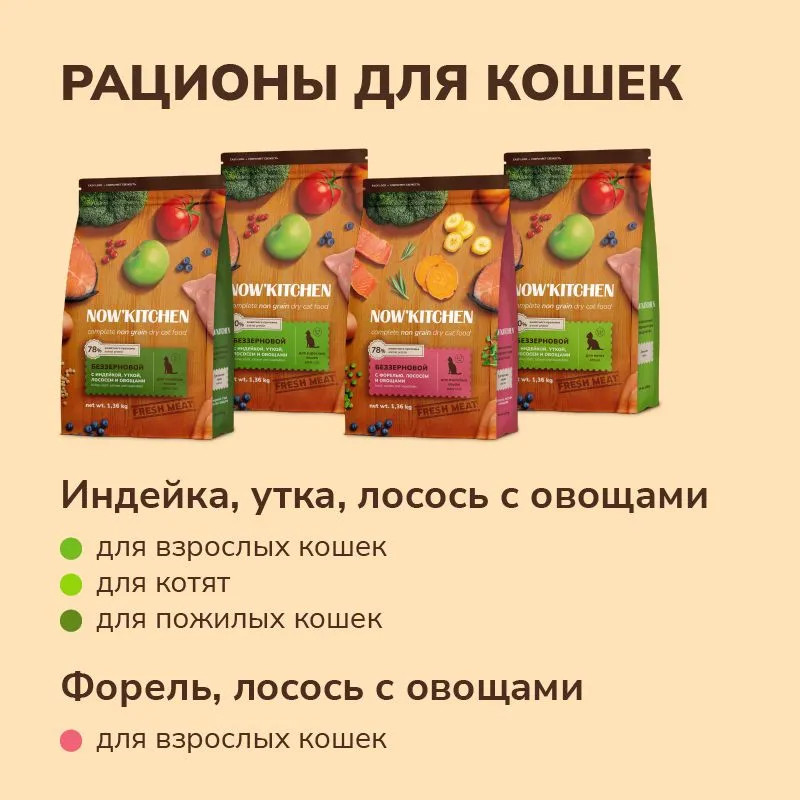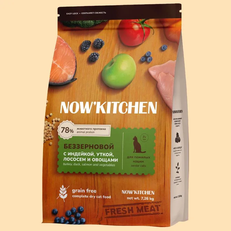 Now'Kitchen Корм для кошек старше 7 лет беззерновой со свежей индейкой, уткой, лососем и овощами «Senior Grain-free Recipe, Turkey, Duck, Salmon»