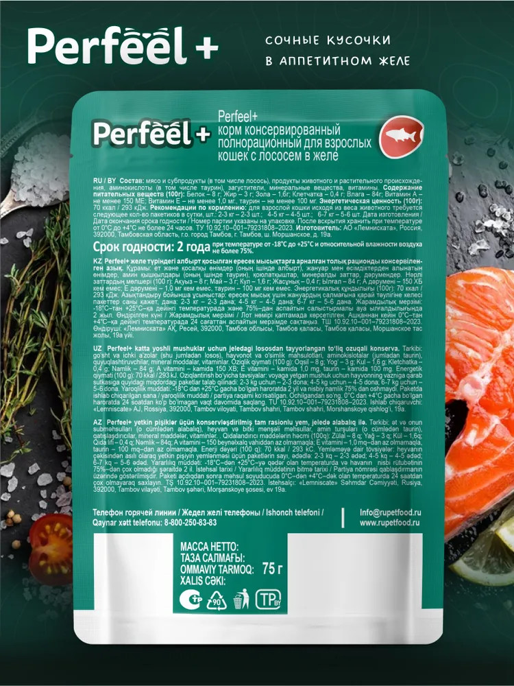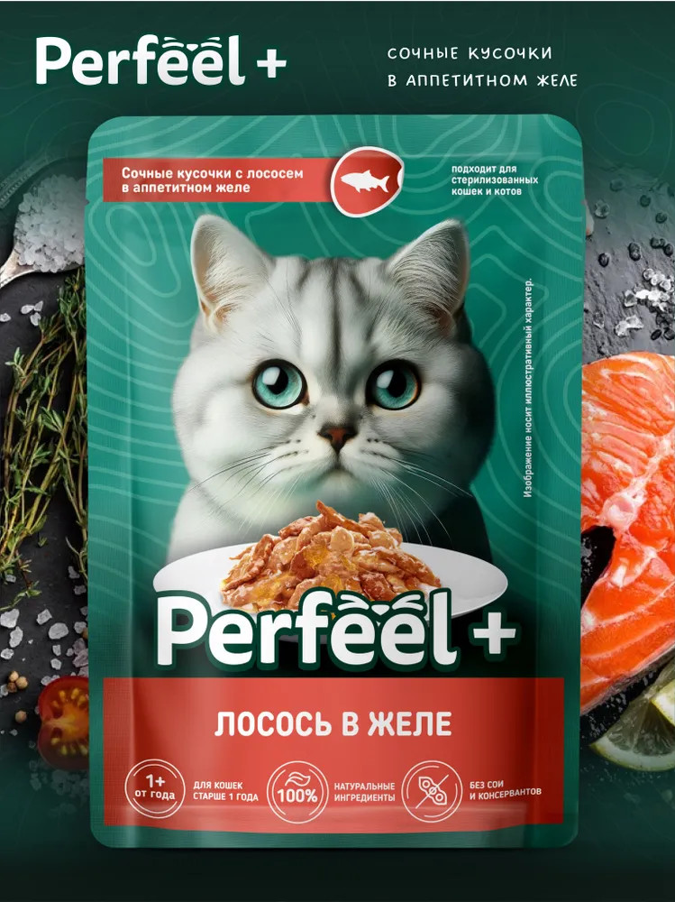 Perfeel Корм консервированный полнорационный для взрослых кошек «Лосось в желе»
