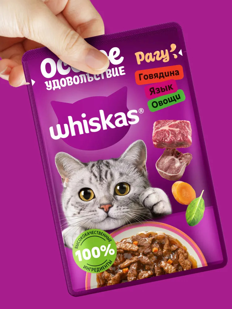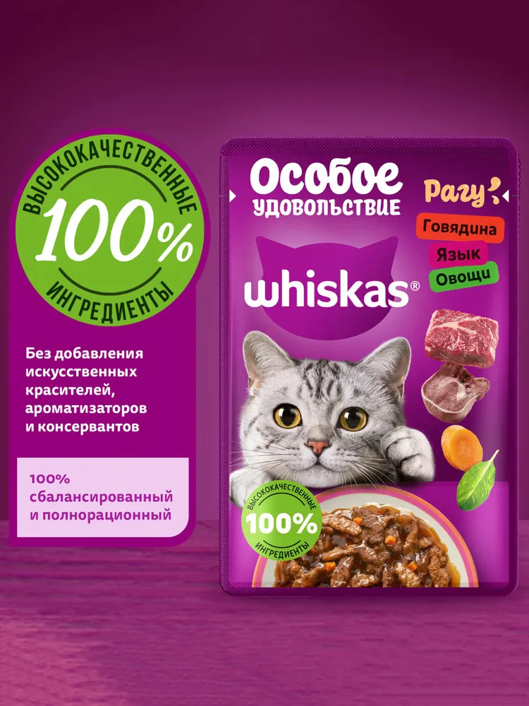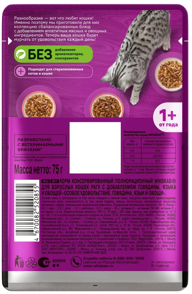 Whiskas Корм влажный для взрослых кошек «Рагу с говядиной, языком и овощами»
