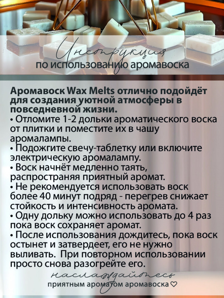 Научно доказано, что ароматы положительно влияют на наше эмоциональное состояние и настроение. Используя ароматический вакс мелтс, вы не только освежите воздух в вашем доме, но и создадите расслабляющую атмосферу, способствующую отдыху и умиротворению. Этот ароматический парфюм станет неотъемлемой частью вашего повседневного ритуала ароматизации. Его многоразовое использование, приятный и нежный аромат, а также стильная упаковка — все это делает его идеальным выбором для людей, которые любят заботиться о своем пространстве и атмосфере в нем.