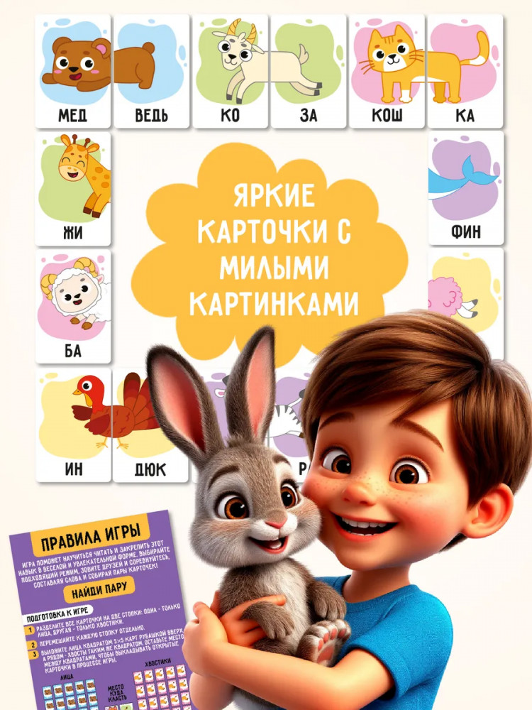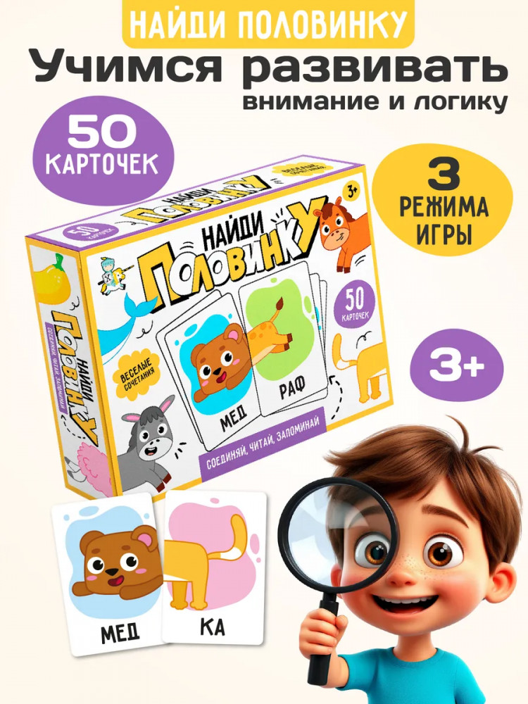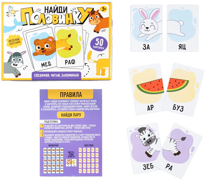 💳 Оплатить за товар можно при получении 🇰🇿 Есть бесплатная доставка по Казахстану от 1 дня 🎁 Копите бонусы с каждой покупки Настольная игра «Найди половинку» — это веселая развивающая игра для детей и всей семьи! Соединяйте мордочки и хвостики животных, читайте получившиеся слова и находите правильные пары. |