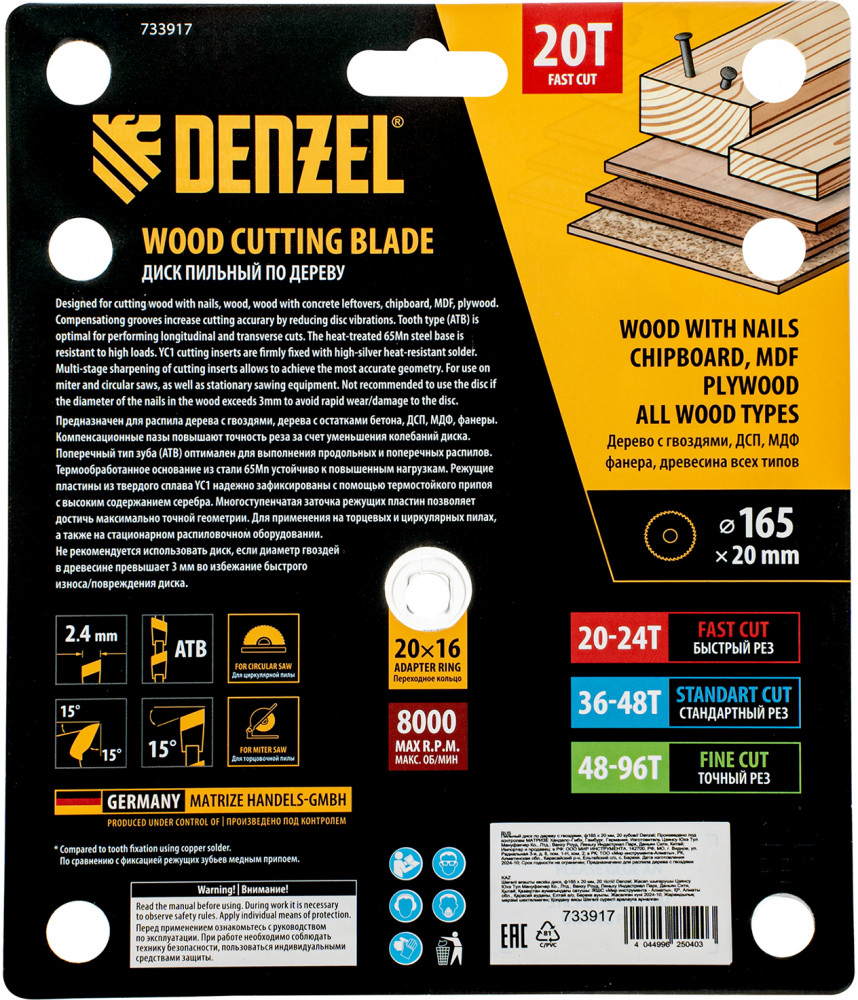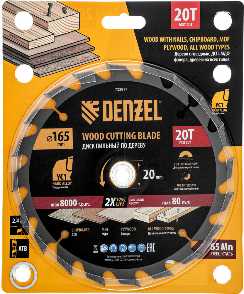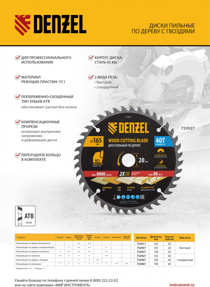 💳 Оплатить за товар можно при получении 🇰🇿 Есть бесплатная доставка по Казахстану от 1 дня 🎁 Копите бонусы с каждой покупки Пильный диск Denzel диаметром 165×20 мм, с 20 зубьями типа ATB, предназначен для быстрого продольного и поперечного распиливания древесины всех типов, в том числе с гвоздями и остатками бетона, а также ДСП, МДФ, фанеры. Режущие пластины из твердого сплава YC1, прошедшие многоступенчатую заточку, позволяют успешно справляться с прочными материалами. Диск устанавливается на циркулярную, торцовочную пилу или на распиловочный станок. В комплект поставки входит переходное кольцо 20/16 мм, позволяющее изменить посадочный диаметр при необходимости. |