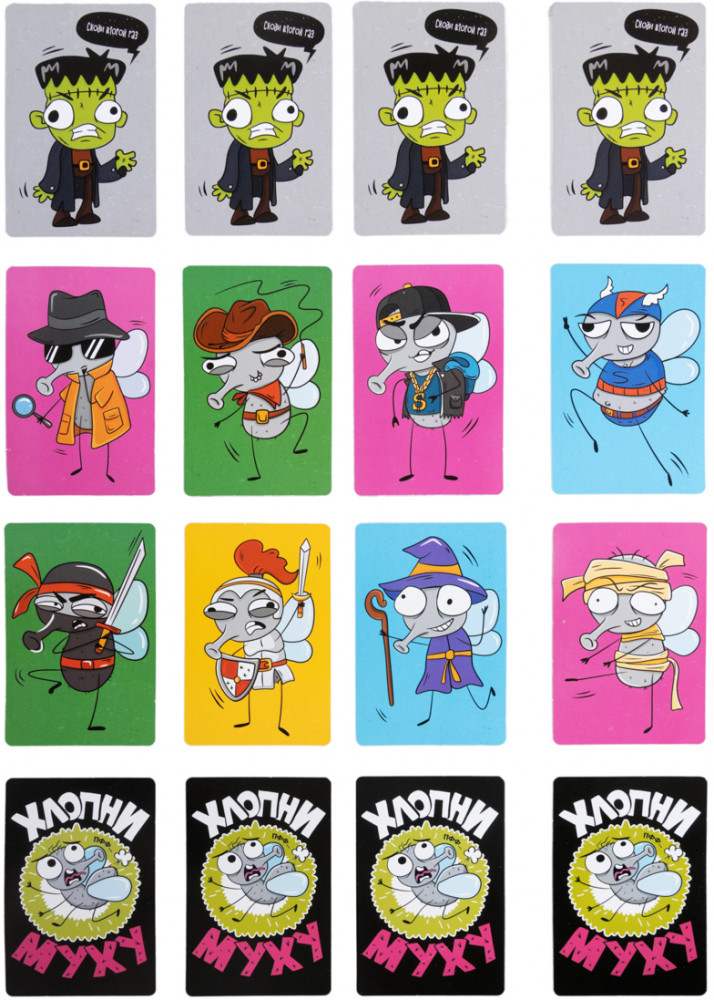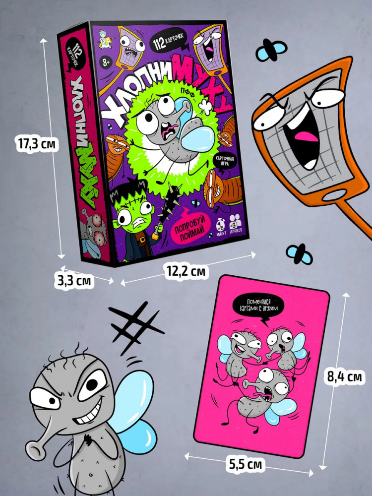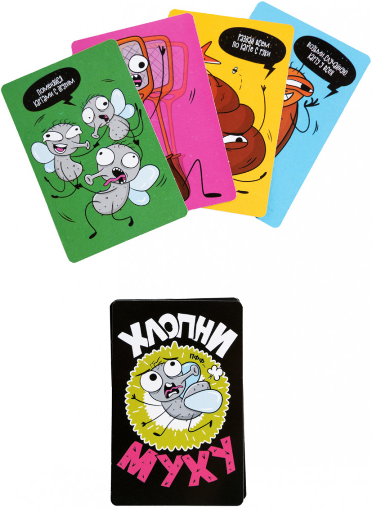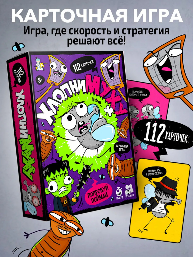 Настольная игра «Хлопни муху» — это взрывная карточная игра, полная азарта, скорости и стратегического мышления! В доме завелась муха. Быстрая, шумная и неуловимая. Хватай мухобойку и покажи всем, кто здесь главный.
