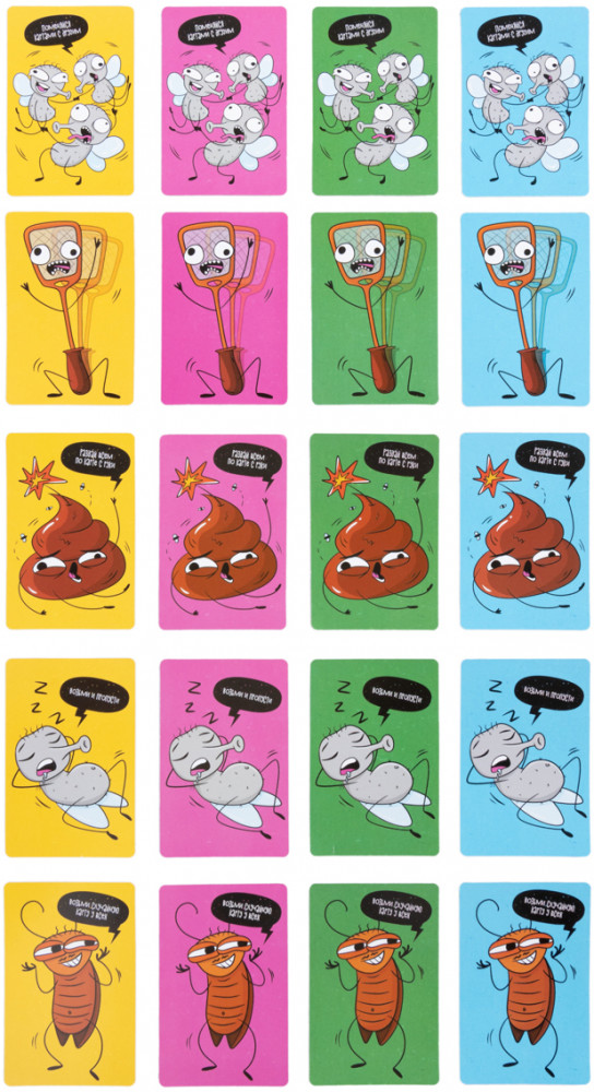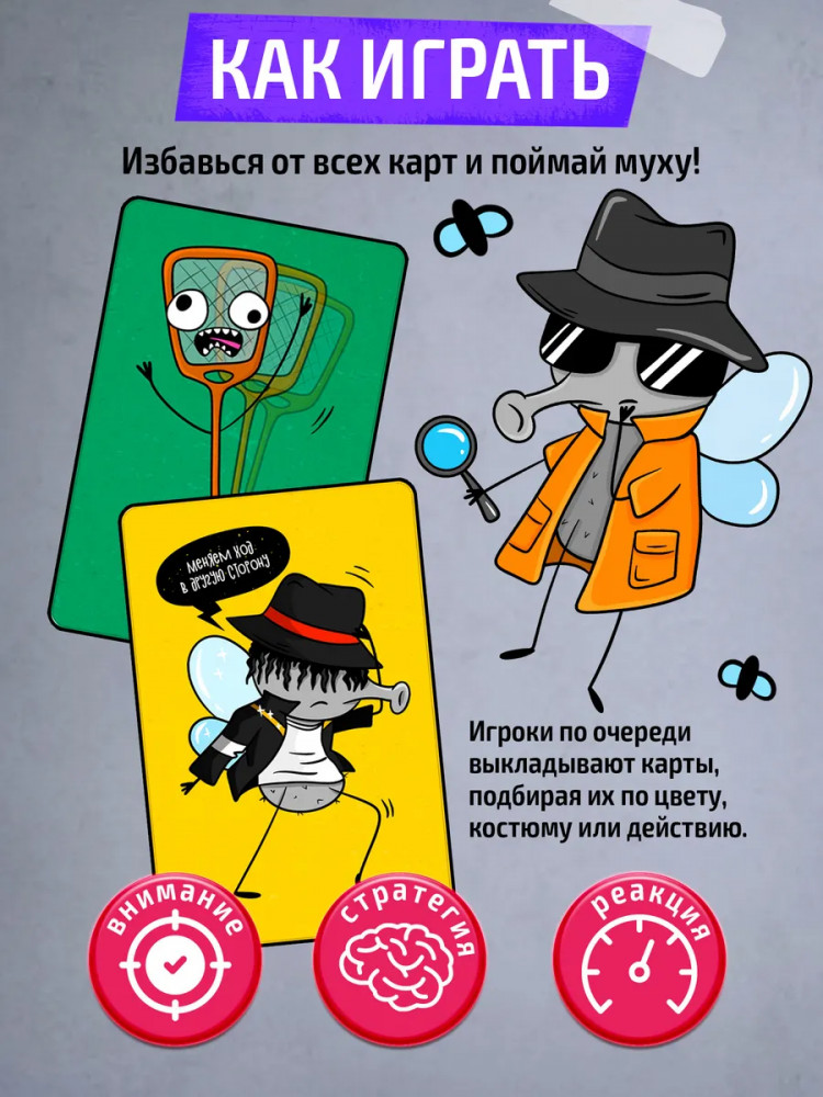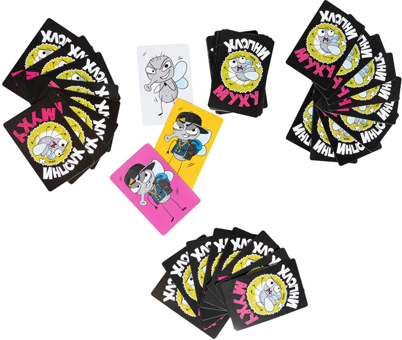 Ваша цель — избавиться от всех карт и поймать муху. Игроки по очереди выкладывают карты, подбирая их по цвету, костюму или действию. Используйте спецприемы, меняйте направление, обменивайтесь картами и мешайте соперникам. Лови муху, строй комбо, действуй быстро и коварно. Побеждает не просто ловец, а самый находчивый игрок в компании.