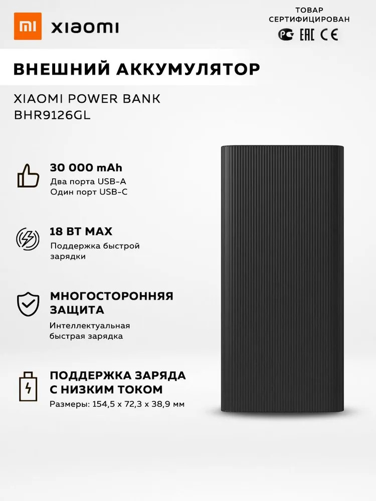 Внешний аккумулятор Xiaomi Mi Power Bank 3 PB3018ZM 30000mAh (черный) — это мощное портативное зарядное устройство с огромной ёмкостью 30000 мА·ч (111 Вт·ч), предназначенное для зарядки смартфонов, планшетов, умных часов, наушников и портативных колонок. Устройство оснащено тремя выходами (USB Type-A и USB Type-C) и двумя входами (microUSB и USB Type-C), что обеспечивает универсальность подключения.