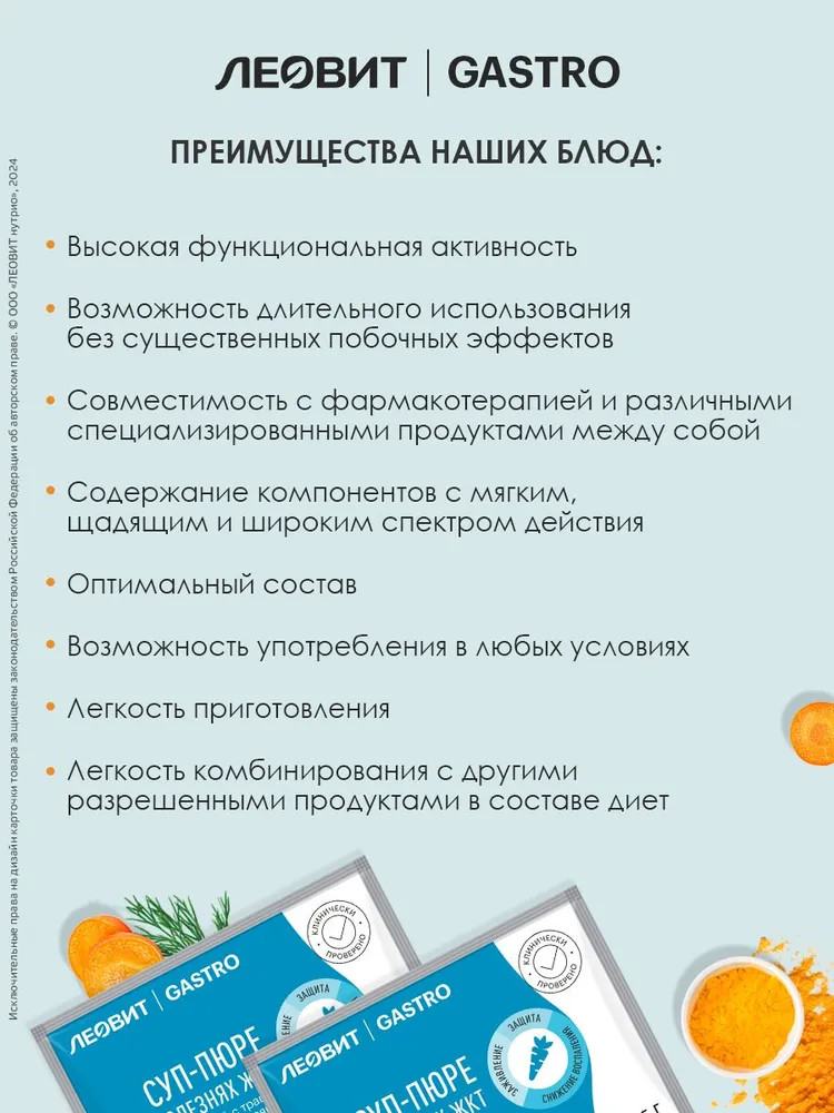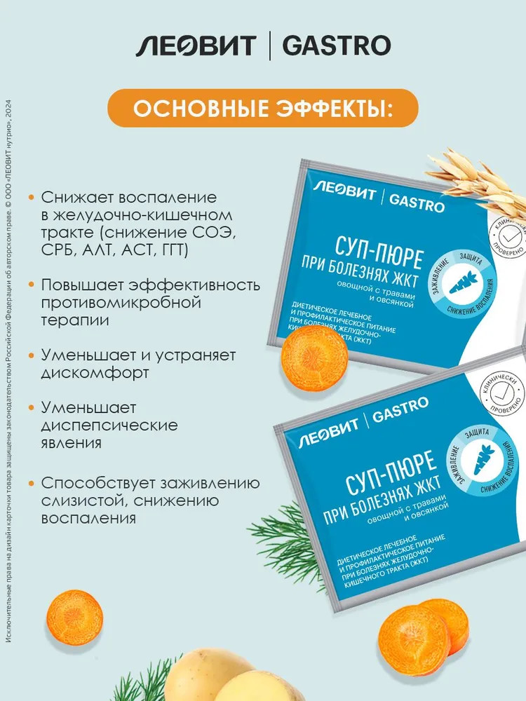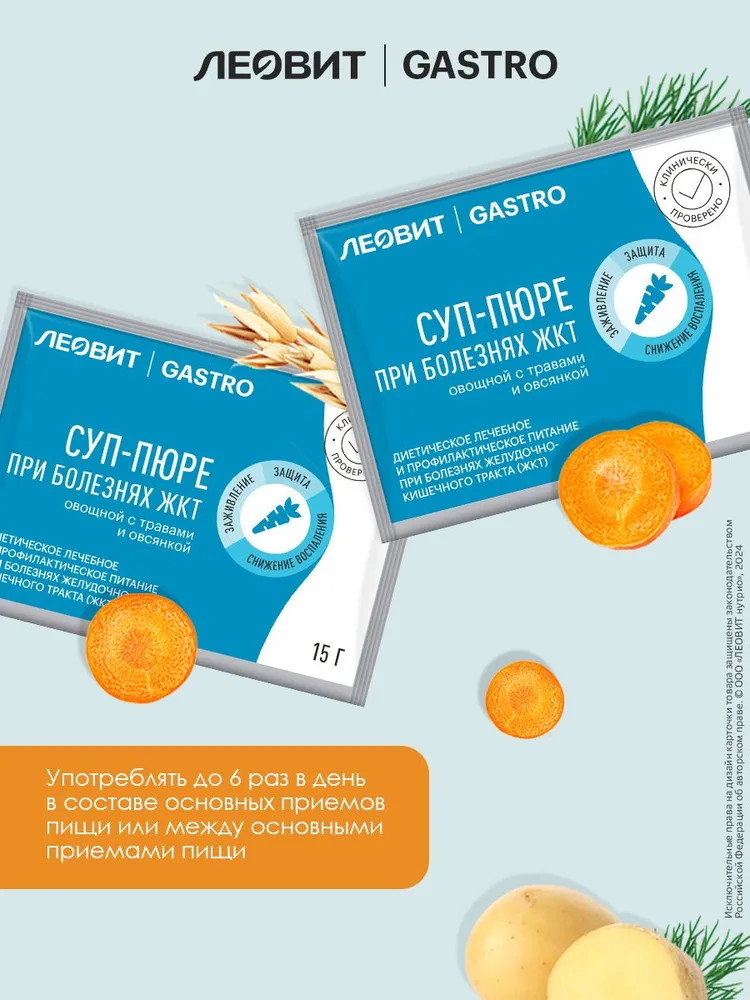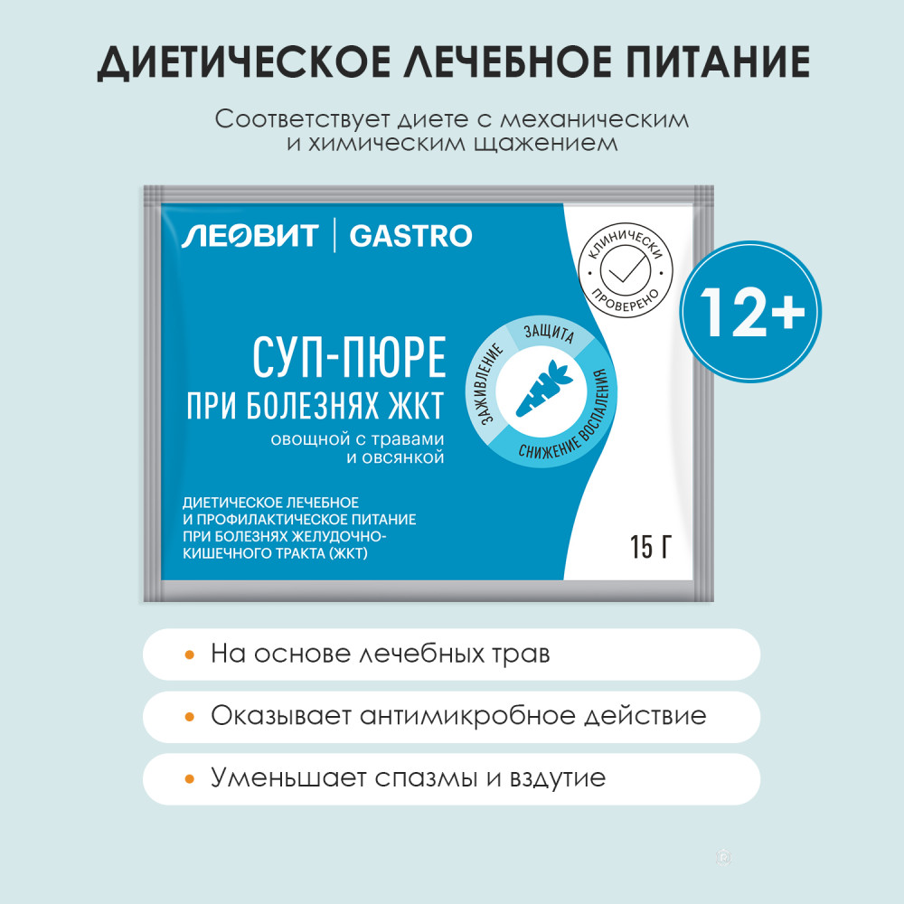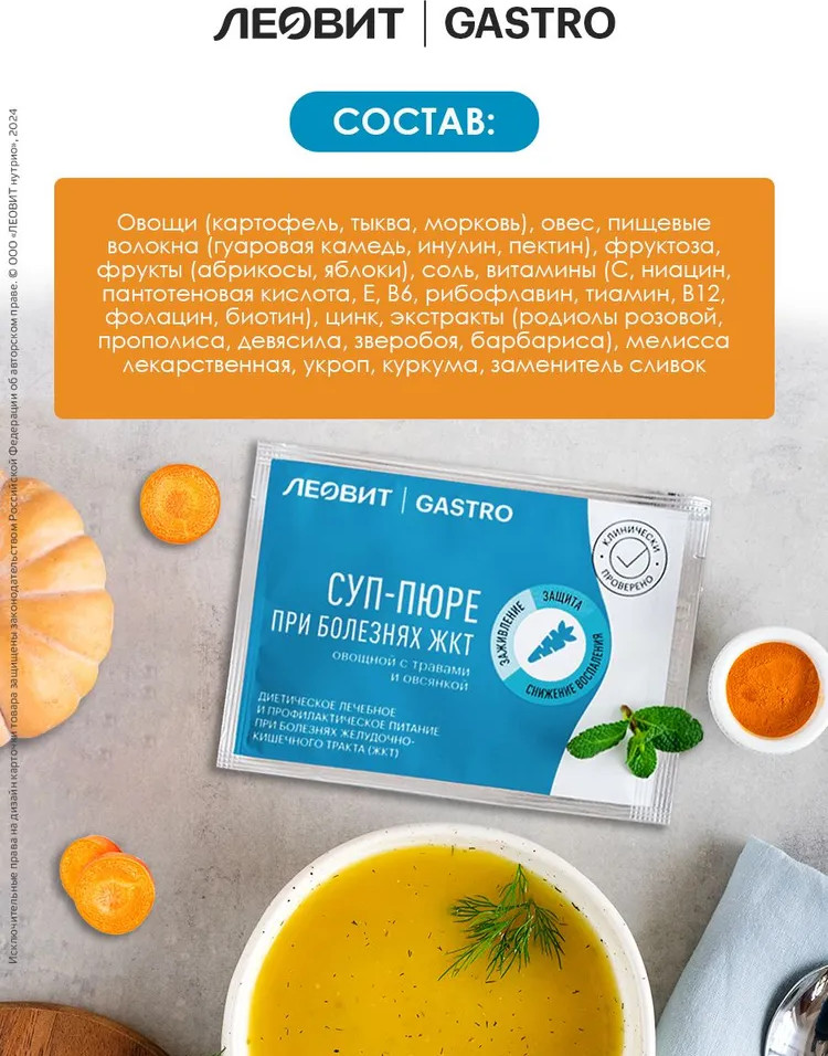 Суп-пюре овощной с травами и овсянкой — эффективный специализированный пищевой продукт диетического лечебного и профилактического питания при болезнях желудочно-кишечного тракта, способствующий снижению воспаления и заживлению слизистой желудка и кишечника. Приготовленный суп-пюре имеет цвет, свойственный ингредиентам, входящим в его состав, а также темные вкрапления, свойственные экстрактам зверобоя, девясила и др.