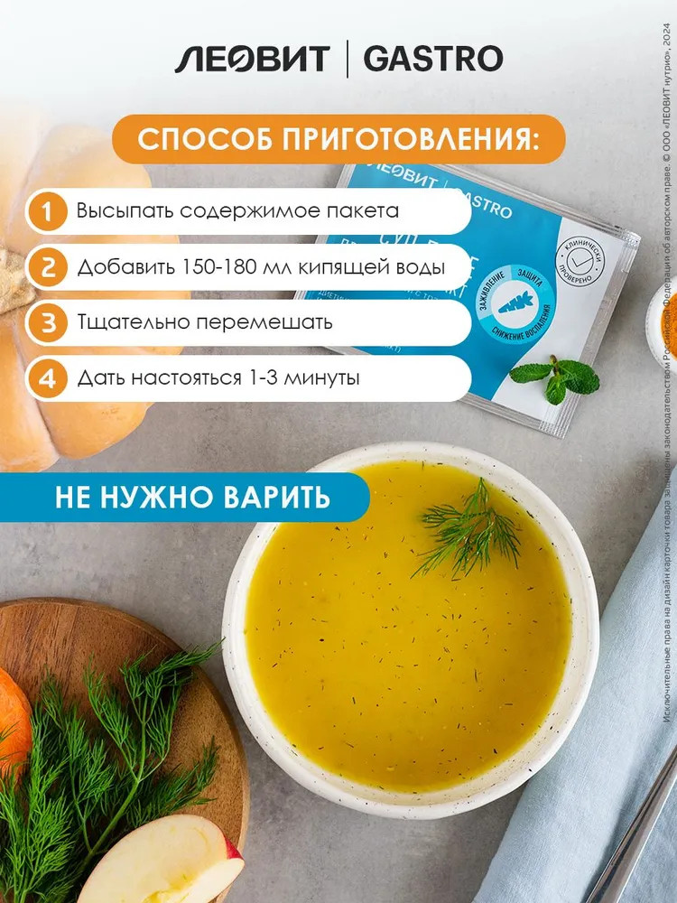 Рекомендации по применению: для приготовления 1 порции готового к употреблению продукта 15 г (или примерно 2 ст. ложки) залить 150-180 мл кипящей воды, тщательно перемешать, настоять 1-3 мин. Употреблять в виде супа-пюре до 6 раз в день в составе основных приемов пищи или между основными приемами пищи. Продолжительность приема 14-21 дней. Для поддержания эффекта курсовой прием можно повторить.