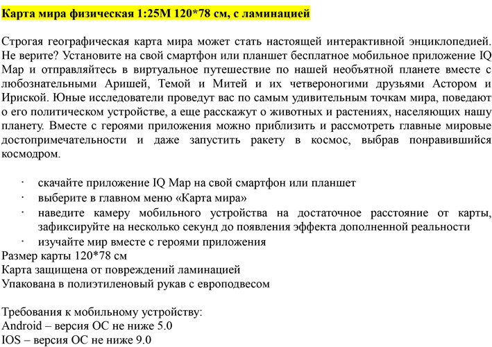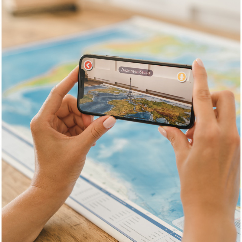 💳 Оплатить за товар можно при получении 🇰🇿 Есть бесплатная доставка по Казахстану от 1 дня 🎁 Копите бонусы с каждой покупки Интерактивная физическая карта мира Globen — серьезное учебное пособие, которое можно легко превратить в интересную обучающую игру. Достаточно просто скачать бесплатное приложение IQ Map на смартфон или планшет, чтобы простая карта превратилась в «живую». Навести камеру смартфона на карту, подождать несколько секунд до появления эффекта AR-технологий. Такая карта, использующая AR-технологии, поможет ребенку намного быстрее и лучше усвоить новую информацию, научит ориентироваться на карте, привьет интерес к новым знаниям. |
