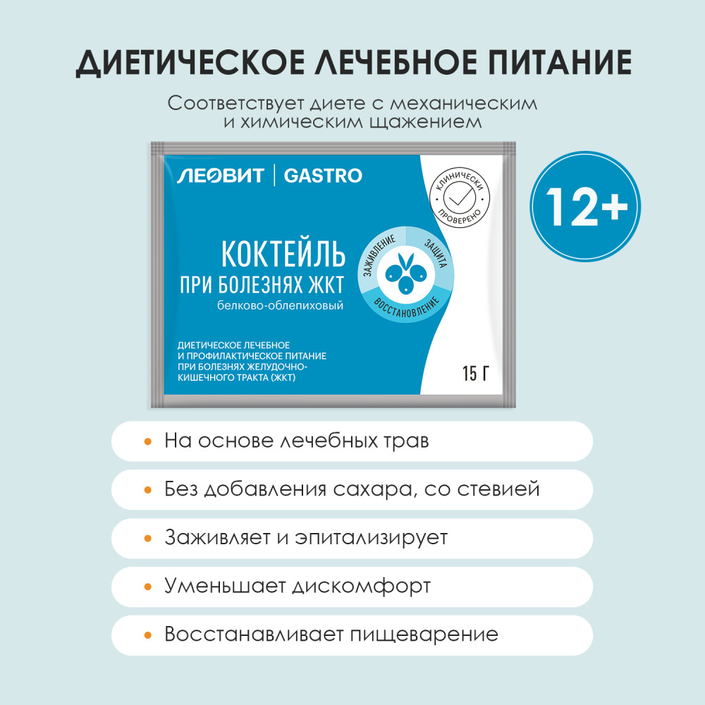 Диетическое лечебное и профилактическое питание «Леовит GASTRO» при болезнях желудочно-кишечного тракта, в которое входят каша, коктейль, суп и БАД. |