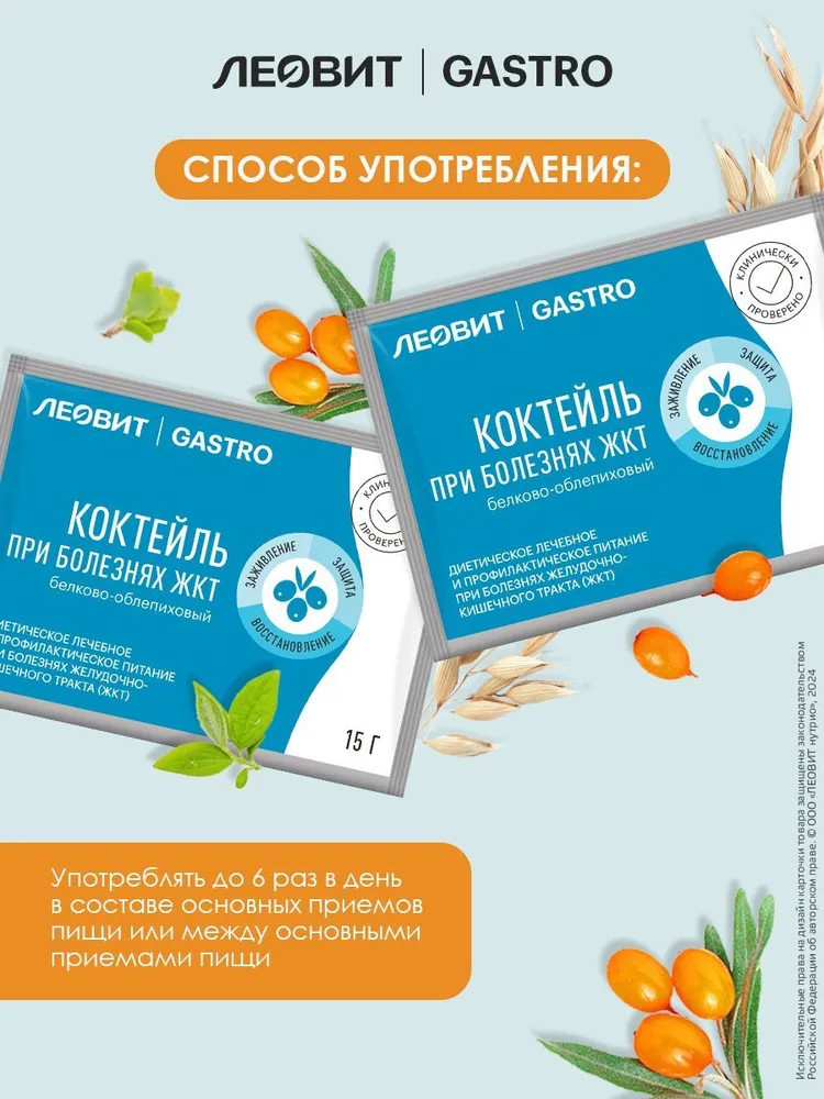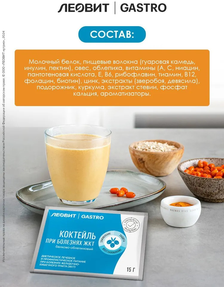 Леовит GASTRO Коктейль белково-облепиховый при болезнях ЖКТВ данный момент этот товар отсутствует в продаже. Возможно, у нас найдется аналогичный или похожий товар здесь. Коктейль белково-облепиховый — эффективный специализированный пищевой продукт диетического лечебного и профилактического питания при болезнях желудочно-кишечного тракта, способствующий эпителизации и восстановлению слизистой желудка и кишечника. Приготовленный коктейль имеет молочно-желтый цвет, свойственный молочному белку и облепихе, а также темные вкрапления, свойственные экстрактам зверобоя, девясила, траве подорожника. |