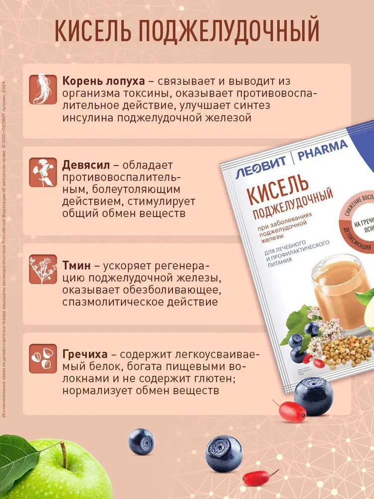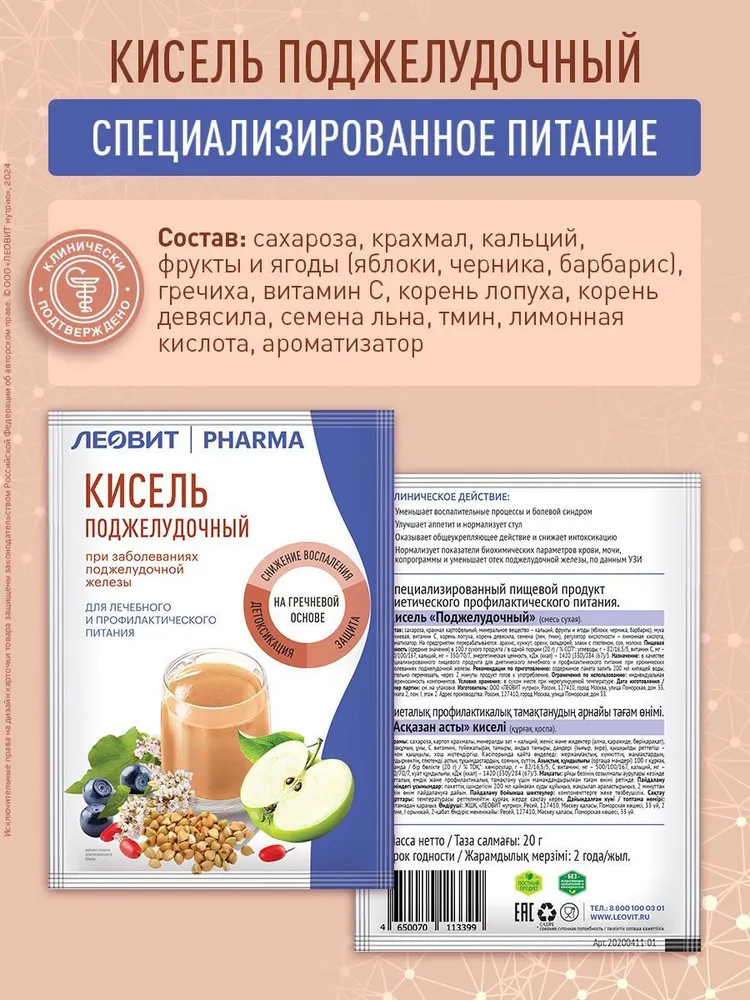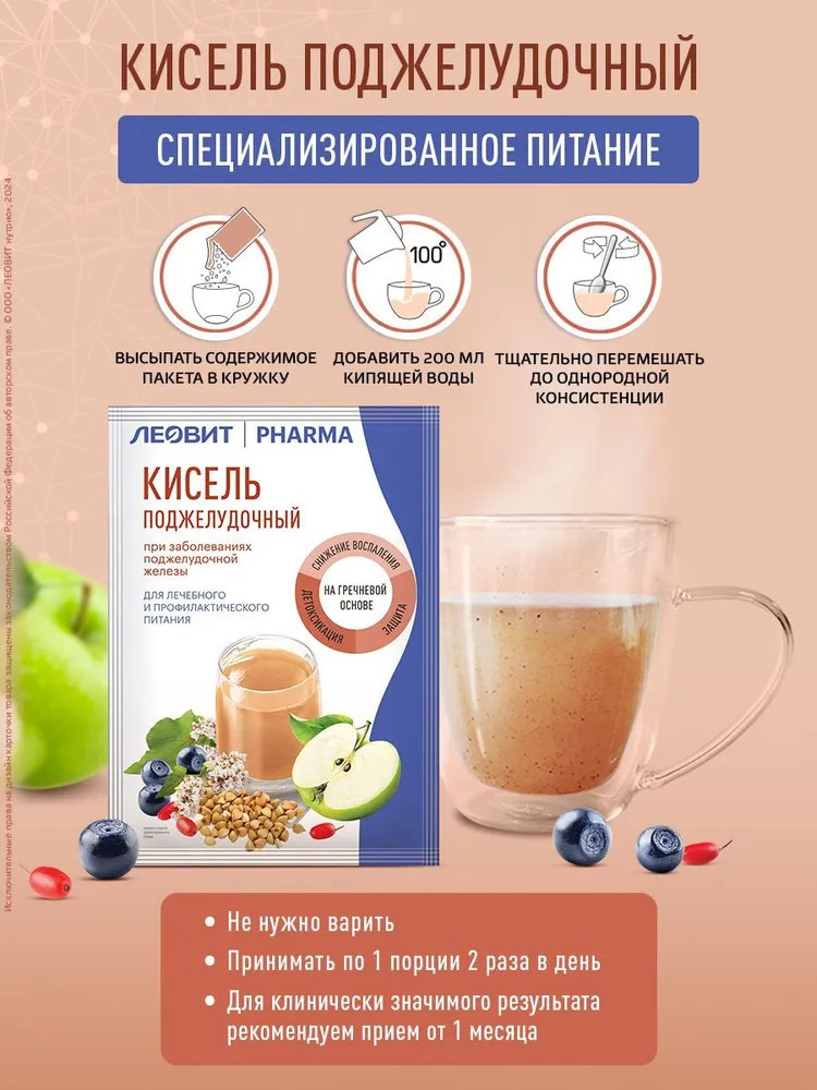 Леовит Pharma Кисель «Поджелудочный»В данный момент этот товар отсутствует в продаже. Возможно, у нас найдется аналогичный или похожий товар здесь. Кисель Леовит Pharma «Поджелудочный» — это специализированный пищевой продукт диетического профилактического питания. Кисель «Леовит» применяется в качестве диетотерапии в комплексной терапии при хронических заболеваниях поджелудочной железы в стадии обострения. Напиток оказывает благоприятное воздействие на функцию поджелудочной железы, способствует уменьшению воспалительных процессов поджелудочной железы, снижает риск обострения хронического панкреатита и эффективен для коррекции питания при хроническом панкреатите. |