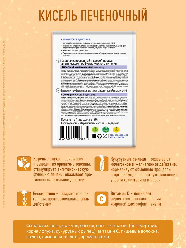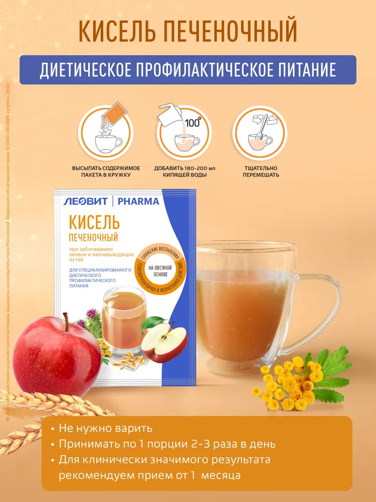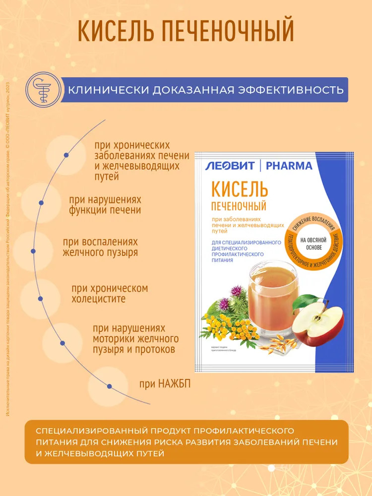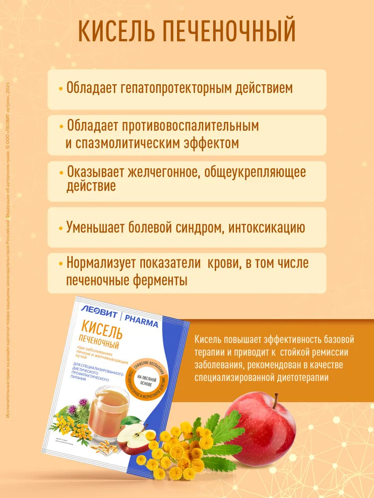 💳 Оплатить за товар можно при получении 🇰🇿 Есть бесплатная доставка по Казахстану от 1 дня 🎁 Копите бонусы с каждой покупки Кисель Леовит Pharma «Печеночный» — это специализированный пищевой продукт диетического профилактического питания при хронических заболеваниях печени и желчевыводящих путей, нарушениях функции печени, воспалениях желчного пузыря, хроническом холецистите и дискинезии, нарушениях моторики желчного пузыря и протоков, НАЖБП. |