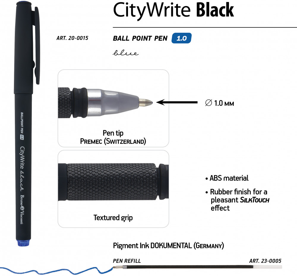 Bruno Visconti Ручкa шариковая «CityWrite. Black»В данный момент этот товар отсутствует в продаже. Возможно, у нас найдется аналогичный или похожий товар здесь. Ручка шариковая «CityWrite» для тех, кто предпочитает толстую, контрастную линию письма. Ее пишущий узел 1 мм. Premec — Швейцария. Пигментные чернила Dokumental — Германия. Корпуса ручек «CityWrite» имеют увеличенный диаметр — 10 мм. Произведены из ударопрочного пластика с антискользящим, бархатистым покрытием Soft Touch, создающим приятные тактильные ощущения. Дополнительную эргономичность ручкам придает текстурированный грип, благодаря которому кисть не напрягается, а пальцы не скользят при письме. |