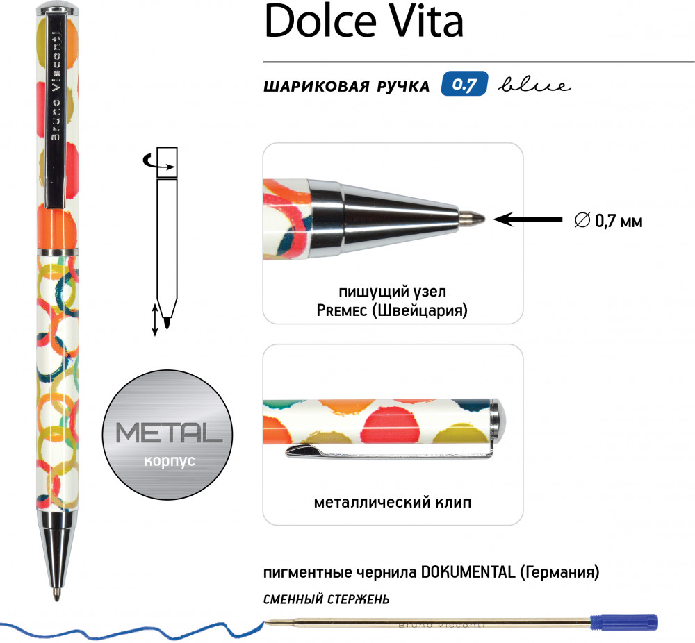 💳 Оплатить за товар можно при получении 🇰🇿 Есть бесплатная доставка по Казахстану от 1 дня 🎁 Копите бонусы с каждой покупки Серия: Dolce Vita Изящная, стильная подарочная ручка «Dolce Vita» от Bruno Visconti — это элегантное украшение рабочего стола. Яркий дизайн металлического корпуса привлечет к себе внимание и не оставит никого равнодушным. Прочность корпуса и нажимной механизм подачи стержня обеспечивают удобство в эксплуатации и долгий срок службы шариковой автоматической ручки. Синие пигментные чернила Dokumental (Германия) и пишущий узел Premec (Швейцария) — гарантируют качественное и мягкое письмо. Ручка в ярком подарочном футляре — отличный вариант для маленького презента прекрасной половине, коллеге, партнеру. |