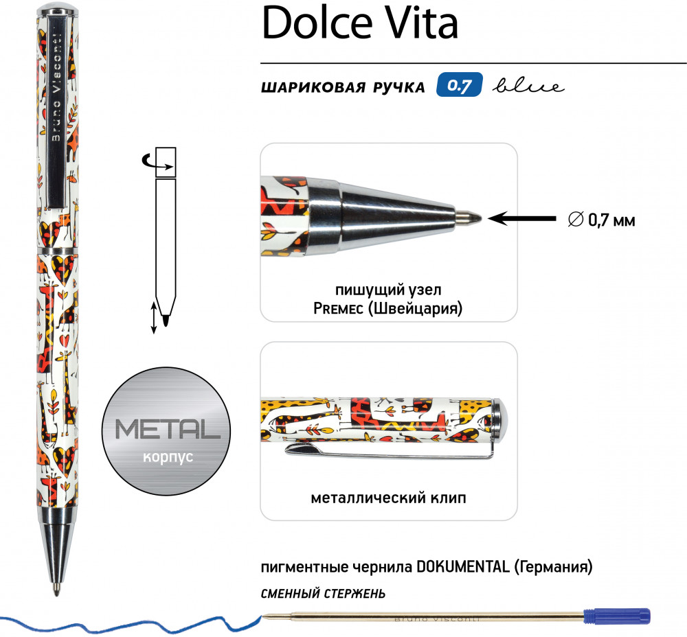💳 Оплатить за товар можно при получении 🇰🇿 Есть бесплатная доставка по Казахстану от 1 дня 🎁 Копите бонусы с каждой покупки Серия: Dolce Vita Изящная, стильная подарочная ручка «Dolce Vita» от Bruno Visconti — это элегантное украшение рабочего стола. Яркий дизайн металлического корпуса привлечет к себе внимание и не оставит никого равнодушным. Прочность корпуса и нажимной механизм подачи стержня обеспечивают удобство в эксплуатации и долгий срок службы шариковой автоматической ручки. Синие пигментные чернила Dokumental (Германия) и пишущий узел Premec (Швейцария) —гарантируют качественное и мягкое письмо. Ручка в ярком подарочном футляре — отличный вариант для маленького презента прекрасной половине, коллеге, партнеру. |
