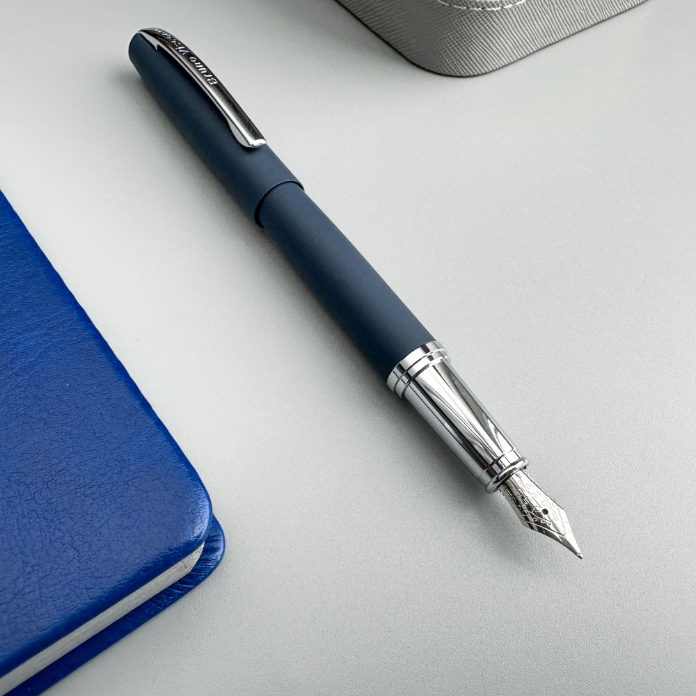 Bruno Visconti Ручка перьевая «Sienna»В данный момент этот товар отсутствует в продаже. Возможно, у нас найдется аналогичный или похожий товар здесь. Cтильная перьевая ручка «SIENNA» от Bruno Visconti синего цвета с контрастирующими элементами в цвет серебра. Благодаря покрытию Soft Touch пальцы не скользят по корпусу ручки, письмо комфортное и легкое. Ручка оснащена высококачественным механизмом подачи чернил, благодаря которому линия остается однородной и аккуратной. Чернила не токсичны, на основе водорастворимого красителя, не забивают фидер. Перьевой наконечник выполнен из иридиума и дополнен орнаментом. |