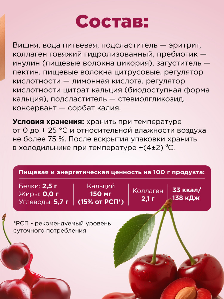 💳 Оплатить за товар можно при получении 🇰🇿 Есть бесплатная доставка по Казахстану от 1 дня 🎁 Копите бонусы с каждой покупки Ягодная свежесть и мягкая консистенция — вишни раскрывается как в спелом пюре. В составе — натуральные компоненты, безопасные подсластители, пищевые волокна из цитрусовых и цикория, кальций, пребиотик инулин. Особенность — добавленный l-карнитин, активно используемый в диетических системах, который помогает использовать жир как энергию для активности. |