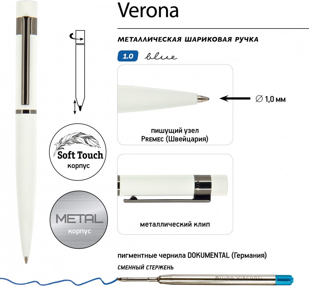 💳 Оплатить за товар можно при получении 🇰🇿 Есть бесплатная доставка по Казахстану от 1 дня 🎁 Копите бонусы с каждой покупки Серия: Verona Металлическая шариковая ручка «Verona» — аксессуар, призванный стать настоящим элементом стиля, подчеркнуть индивидуальность его владельца. Как и все подарочные ручки «Bruno Visconti», «Verona» — обладательница стержня с пишущим узлом от швейцарского производителя Premec и перманентными чернилами немецкого производителя Dokumental. Поэтому можно быть абсолютно уверенным в качестве письма. Сам стержень легко и бесперебойно выдвигается за счет мягкого поворотного механизма подачи. В ручке нет ничего лишнего, но она привлекает к себе внимание. Несмотря на увеличенный диаметр корпуса — 12 мм, она изящна благодаря плавным линиям, эргономичному корпусу с покрытием Soft Touch. Контраст добавляют кольцо и клип из глянцевого темного металла. Ручка готова к персонализации. Отличный бизнес-сувенир! |