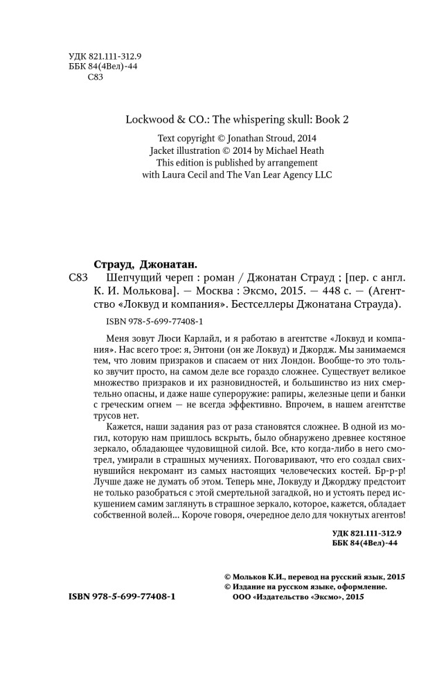 Отличное продолжение отличного начала! После Черепа я еще раз убедилась, что Страуд один из лучших писателей хорошего подросткового фэнтези. Книга держит в напряжении и не отпускает до самого конца. Ты переживаешь с героями их приключения, радуешься их победам, расстраиваешься если у них что-то не получается. И читаешь-читаешь-читаешь. Автор сделал все, что было в его силах, чтобы после того как читатель перевернет последнюю страницу романа, побежал покупать продолжение. Что я и собираюсь сделать.