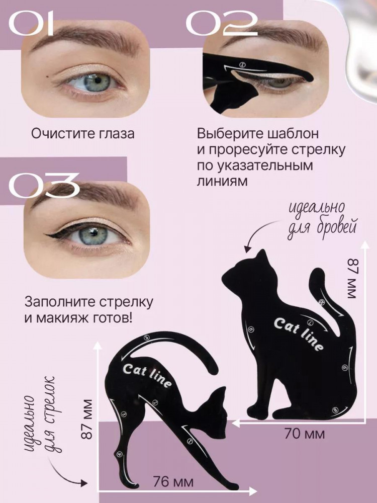 Шаблоны помогут вам подчеркнуть красоту глаз, сделать их выразительными и придать лицу утонченность. Благодаря удобной форме апликатора можно корректировать линии на веках, создавая классический или лисий взгляд. Трафарет подходит для работы с подводкой, карандашом или тенями. Такой аксессуар станет отличным помощником в рисовании контуров век при создании стрелок любой сложности.
