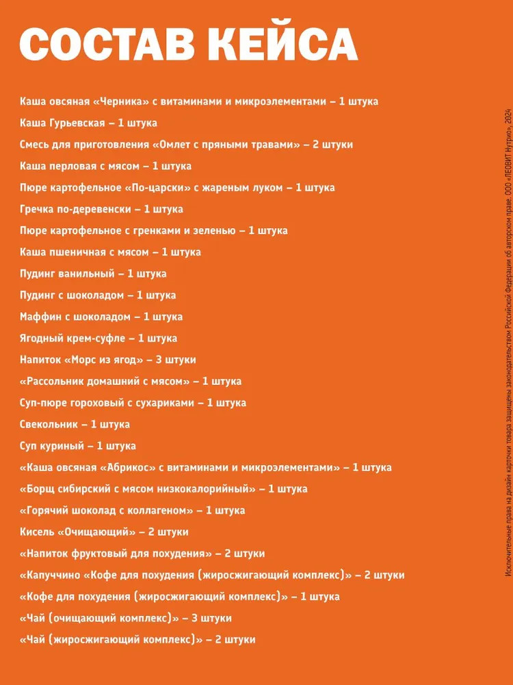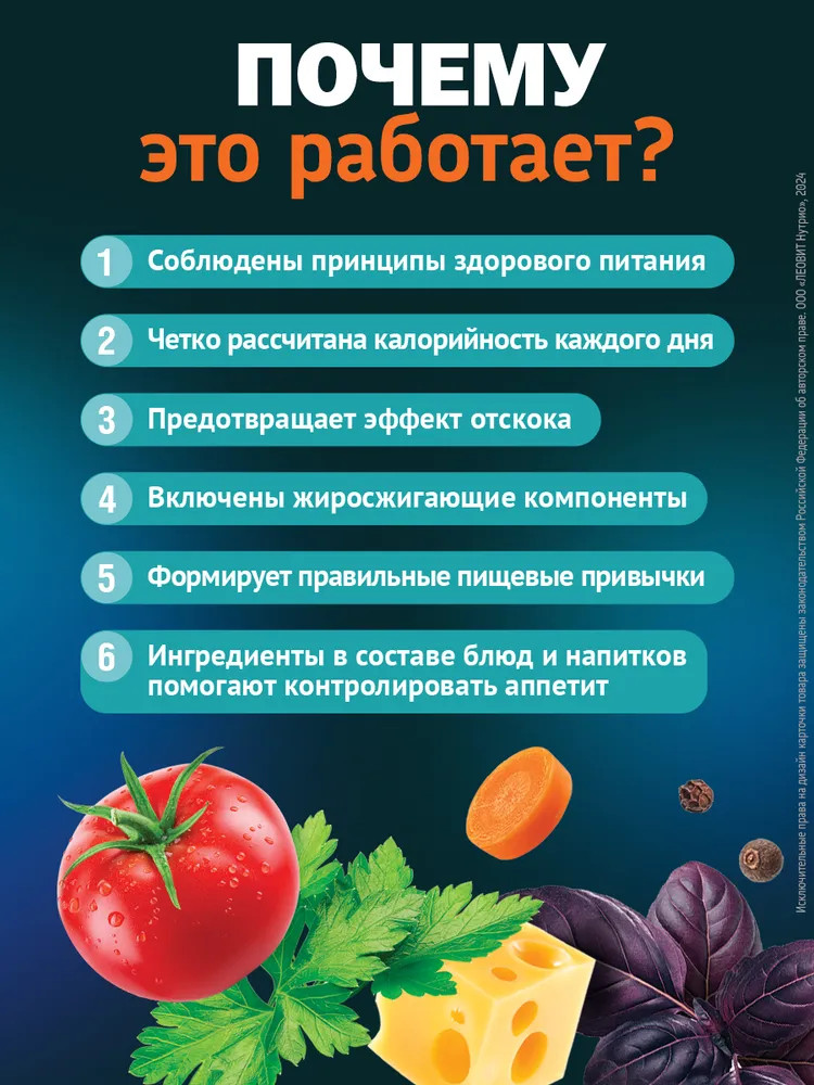 💳 Оплатить за товар можно при получении 🇰🇿 Есть бесплатная доставка по Казахстану от 1 дня 🎁 Копите бонусы с каждой покупки Специализированная комплексная программа сбалансированного питания для снижения веса с пониженной калорийностью «Русская диета» — это уникальная система для похудения, разработанная для женщин, мужчин и подростков с 14 лет. Она объединяет традиции различных регионов России и современные подходы диетологии. Программа рассчитана на неделю и включает в себя 35 порций блюд быстрого приготовления. Цель программы «Худеем за неделю» — помочь сформировать правильные пищевые привычки. В течение первых пяти дней мы предлагаем сбалансированный и комфортный рацион, чтобы облегчить адаптацию к новой системе питания. На оставшиеся два дня мы предоставляем четкие рекомендации, чтобы вы могли следовать нашей системе питания максимально эффективно. Диета рекомендована при избыточном весе и ожирении, заболеваниях, связанных с сердечно-сосудистой системой, НАЖБП, метаболическом синдроме и для снижения риска развития сахарного диабета. |