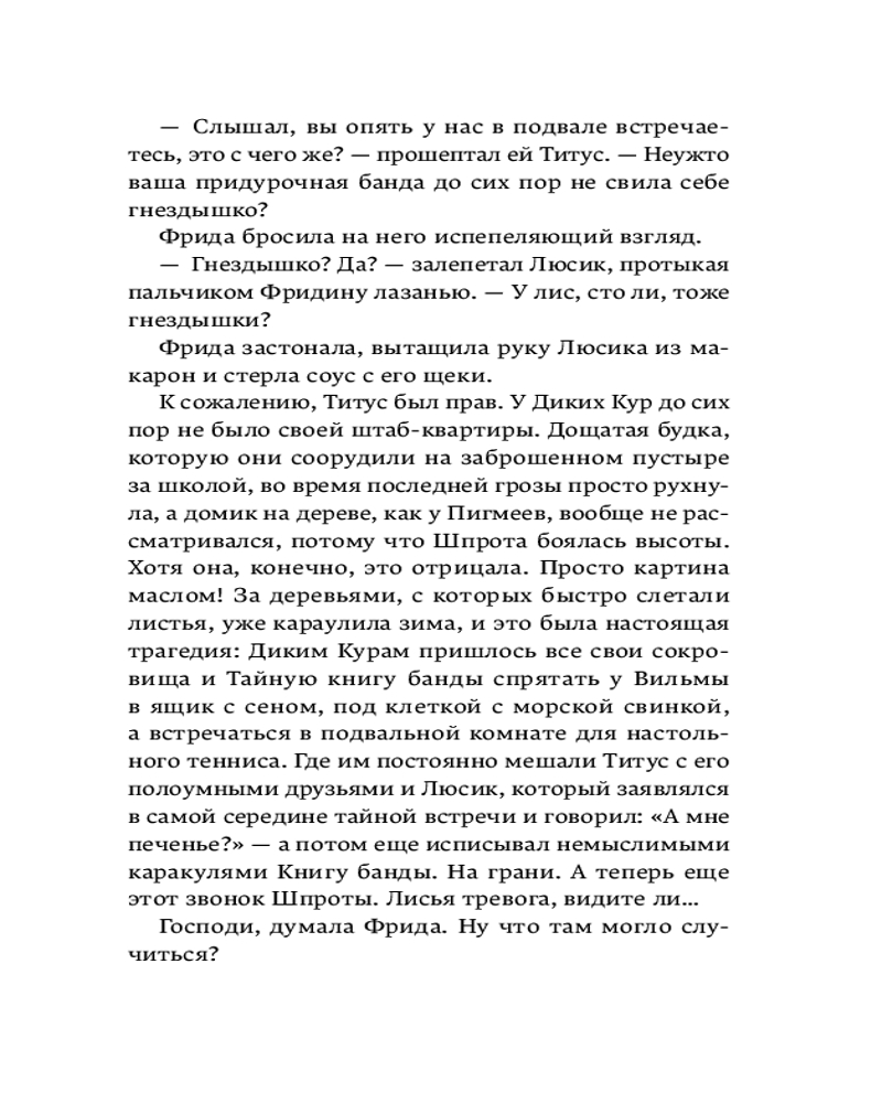 💳 Оплатить за товар можно при получении 🇰🇿 Есть бесплатная доставка по Казахстану от 1 дня 🎁 Копите бонусы с каждой покупки Серия: Popcorn Books. Миры Корнелии Функе У Диких Кур звучит тревога: лиса на пороге! Но это не просто хищник, а сигнал настоящей беды. Под угрозой — их любимые курочки, ставшие символом банды и дружбы. Чтобы помочь пернатым, девочкам предстоит разработать сложный план. Однако справиться будет не так просто, и им придется обратиться за помощью к Пигмеям. Миссия по спасению превращается в шпионское приключение — с тайными вылазками, хитрыми уловками и риском попасться с поличным. Друзья не всегда рядом с самого начала — иногда они приходят в самый нужный момент. |