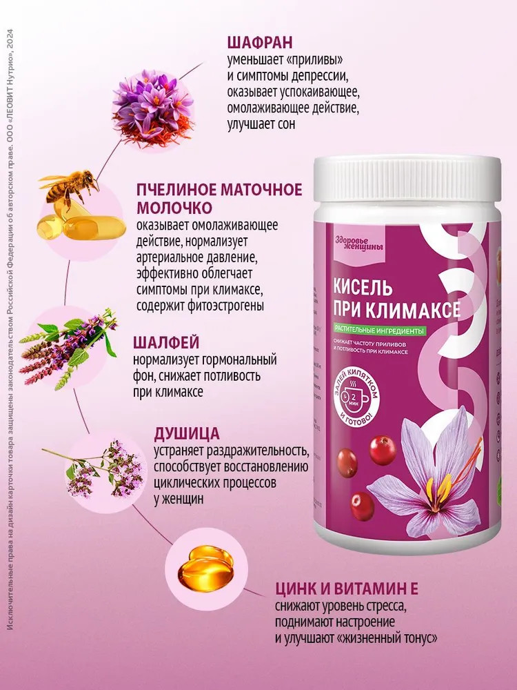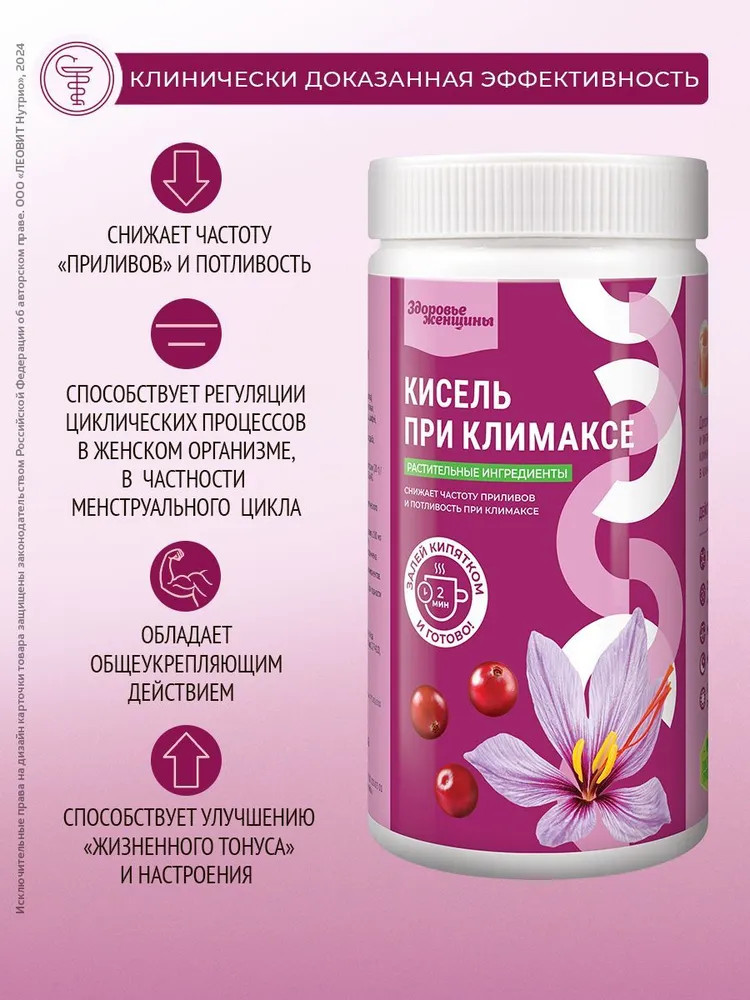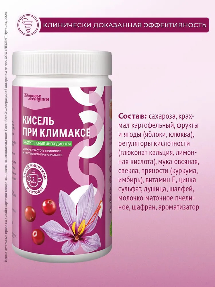 | Специализированная линейка негормональных природных и безопасных продуктов от «Леовит», созданная специально для женщин. В линейку входят кисель «При климаксе» и БАД «Фитоклимаксные», которые помогают облегчению симптомов при климактерических расстройствах, вызванных возрастными изменениями или преждевременной менопаузой. |