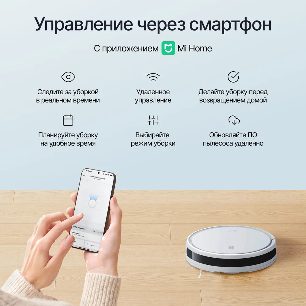 • управление: с помощью приложений Mi Home можно настраивать график уборки, останавливать или возобновлять уборку;