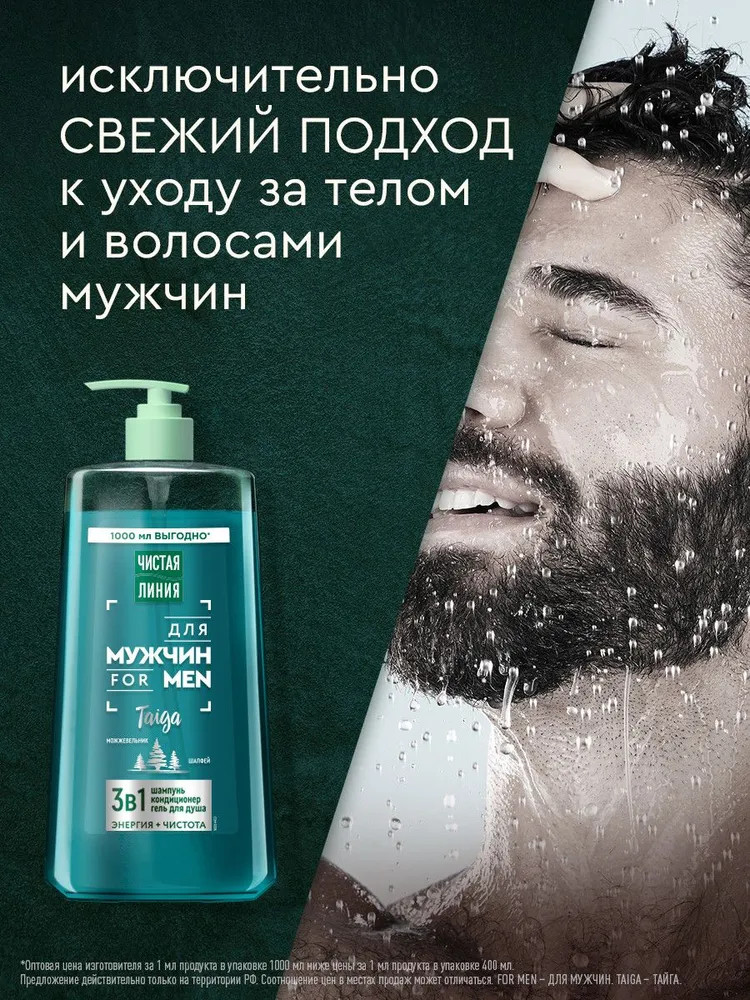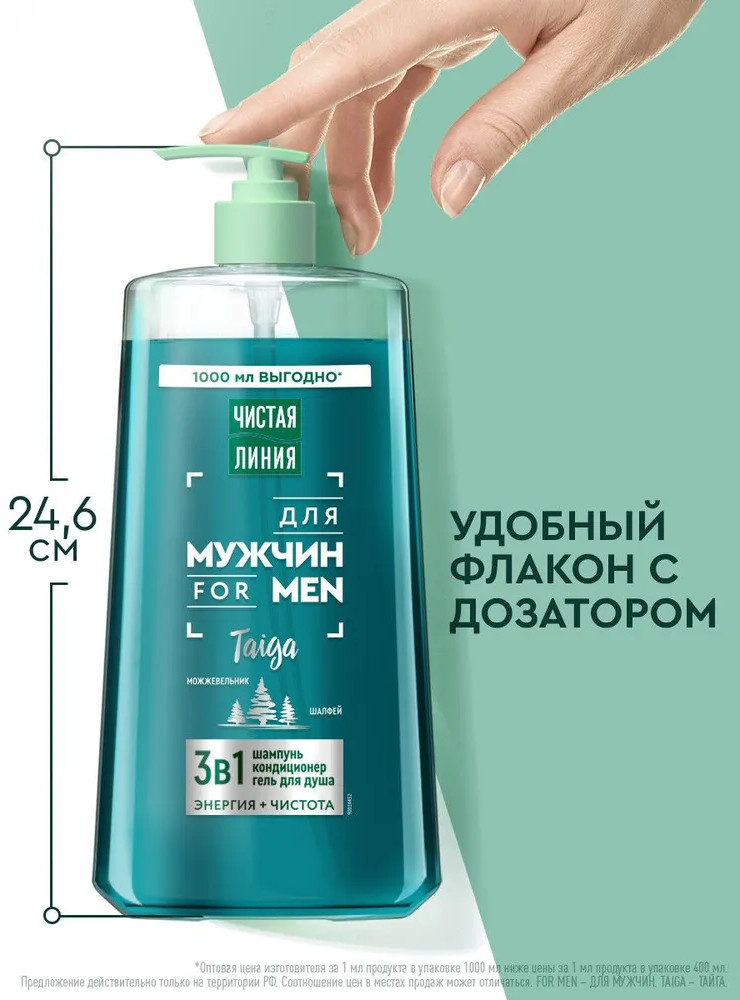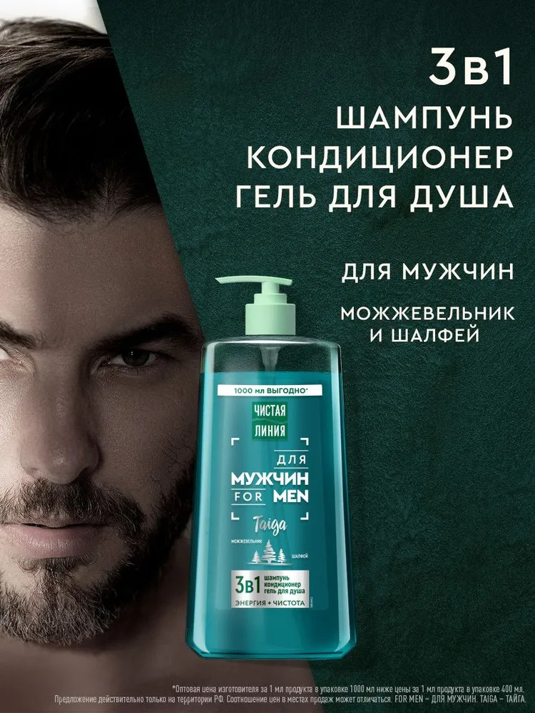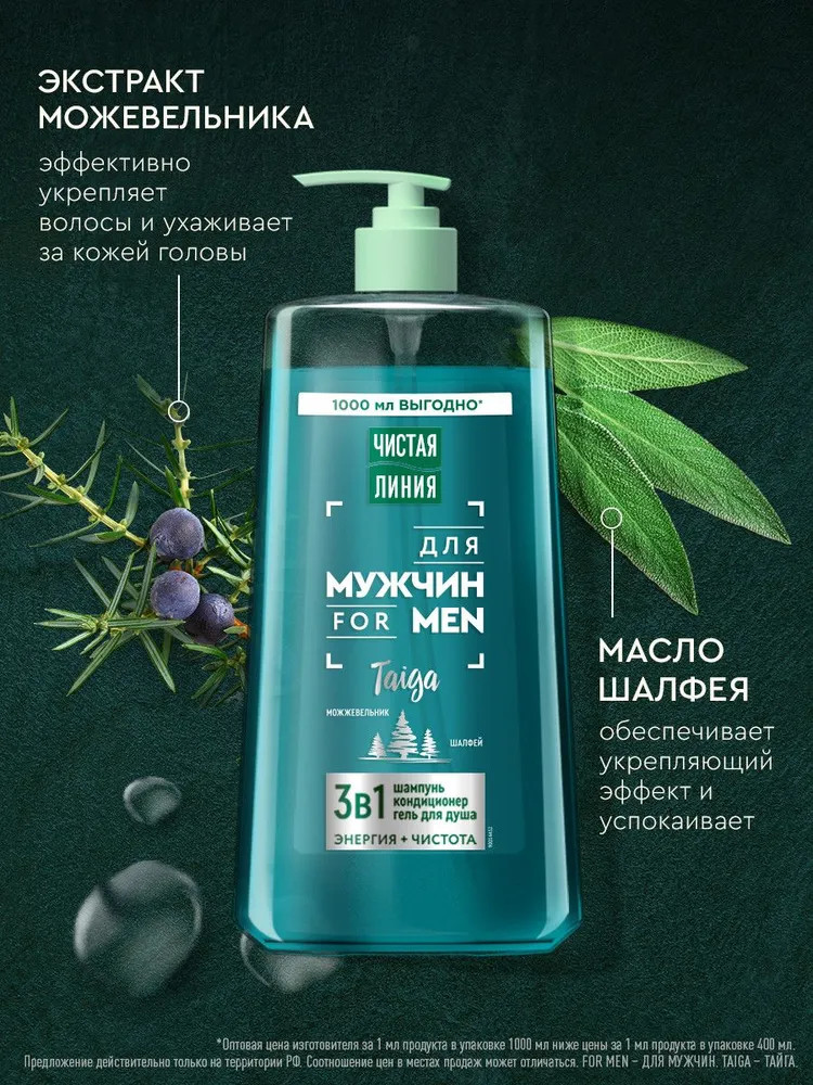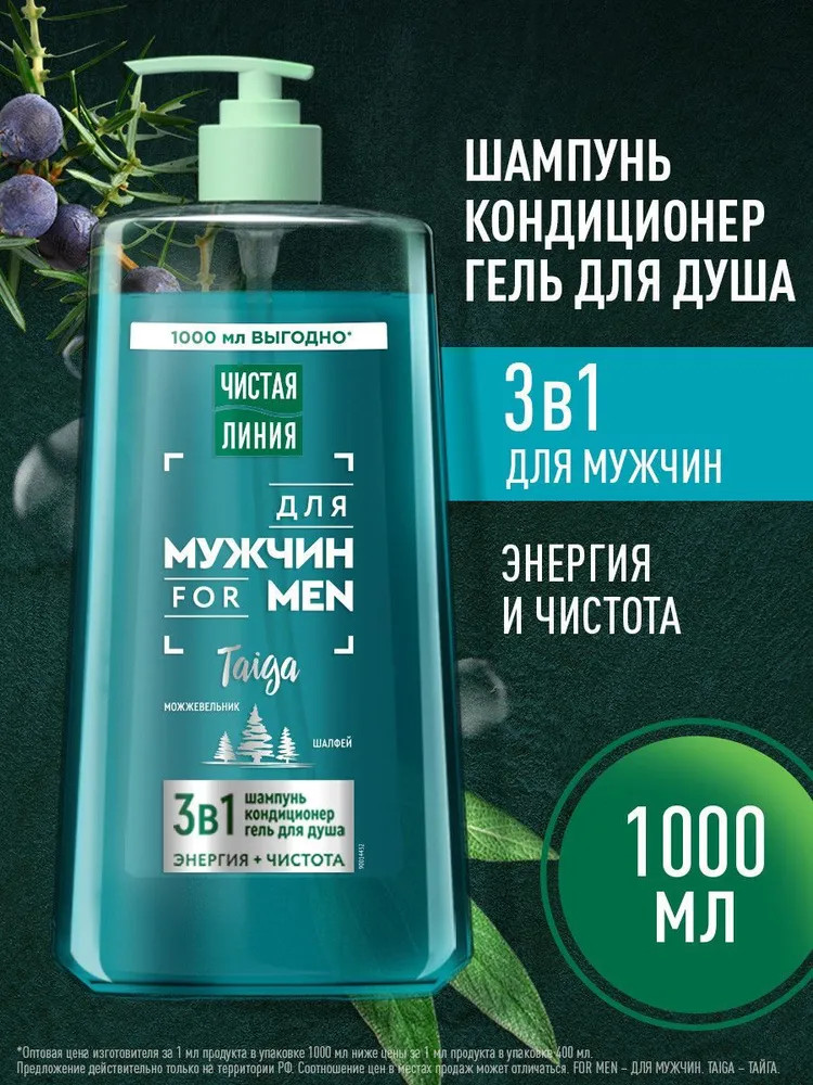 Чистая линия Шампунь-кондиционер и гель для душа мужской 3 в 1 «Энергия и чистота. Можжевельник и шалфей»