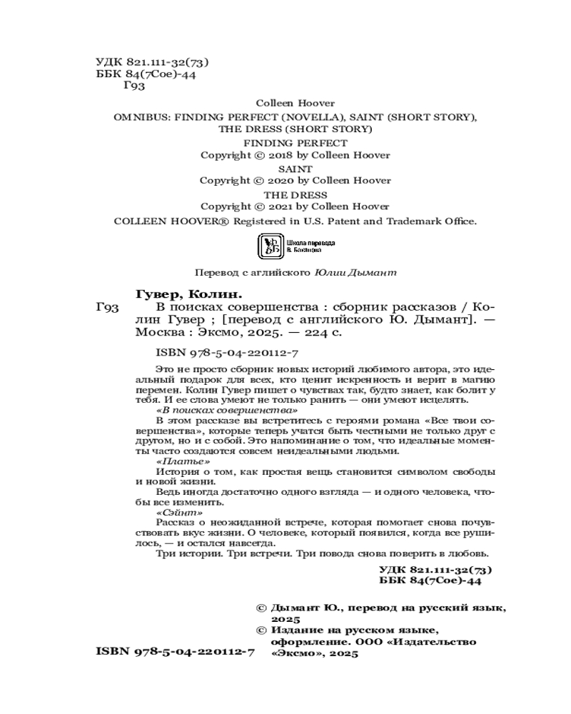 💳 Оплатить за товар можно при получении 🇰🇿 Есть бесплатная доставка по Казахстану 🎁 Копите бонусы с каждой покупки Серия: Все твои совершенства. Главные романы Колин Гувер (обложка) Любовь не приходит по расписанию, но этот подарок ты получишь вовремя. Это не просто сборник новых историй любимого автора, это идеальный подарок для всех, кто ценит искренность и верит в магию перемен. Колин Гувер пишет о чувствах так, будто знает, как болит у тебя. И ее слова умеют не только ранить — они умеют исцелять. Колин Гувер — автор, которому читатели доверяют свое сердце. Более 5 000 000 000 просмотров в TikTok. Подарочный покет с цветным обрезом и кремовой бумагой. |