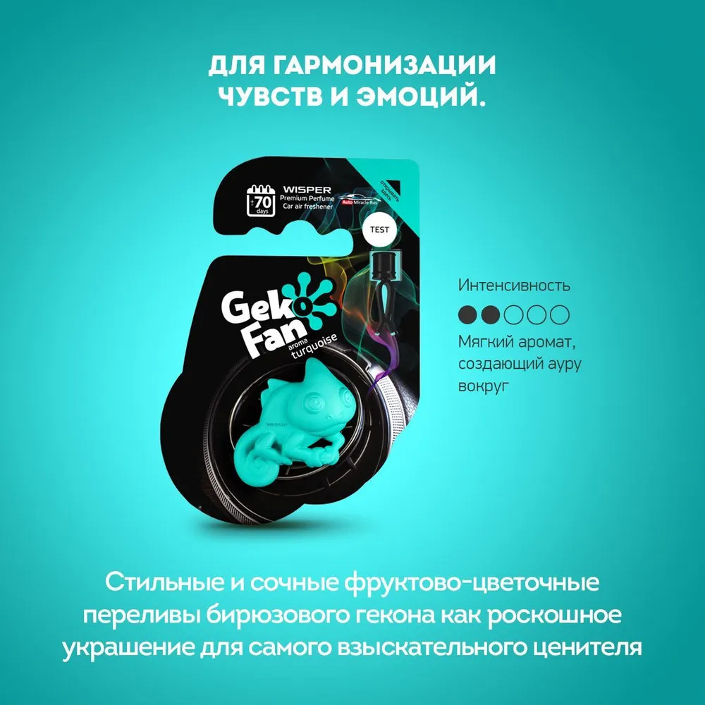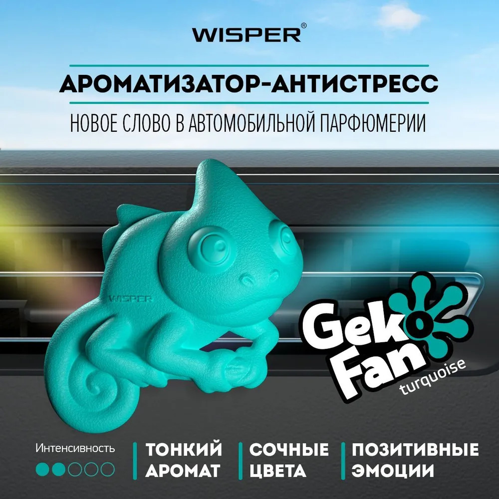 Wisper GekoFan — новое слово в автомобильной парфюмерии. Это ароматизатор-антистресс, который позволит вам не только наслаждаться приятными ароматами в дороге, но и все время быть в тонусе, избегая утомления и неприятных мыслей. Wipser Gekofan Turquoise: стильные и сочные фруктово-цветочные переливы бирюзового гекона как роскошное украшение для самого взыскательного автовладельца. Аромат способствует стопроцентной гармонии чувств и эмоций.