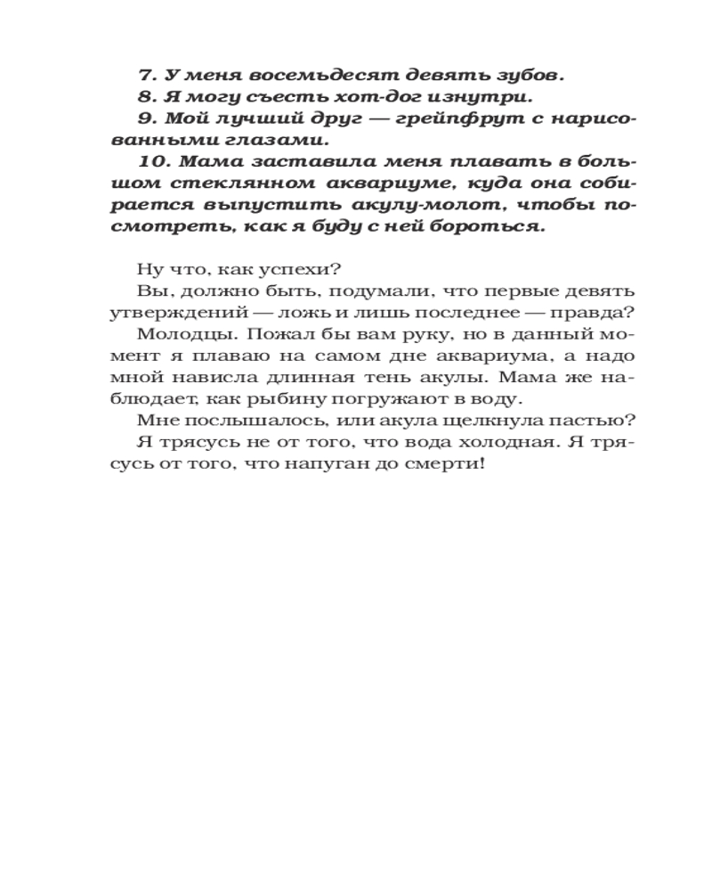💳 Оплатить за товар можно при получении 🇰🇿 Есть бесплатная доставка по Казахстану от 1 дня 🎁 Копите бонусы с каждой покупки Серия: Ужастики Р. Л. Стайна Мама Лиама — режиссер-документалист. Ее новый проект — эпизод для суперпопулярного шоу «Ночь акул»: двенадцатилетний мальчик, вооруженный лишь видеокамерой, противостоит акуле-молоту в огромном аквариуме. К сожалению, приглашенный актер получает травму перед самым началом съемок, так что в аквариум отправляют Лиама. Ничего страшного, ведь акула старая и почти беззубая, так что с ним все будет в порядке. Вот только когда акулу опускают в аквариум, Лиам понимает, что что-то не так... К нему посадили НЕ ТУ акулу! |