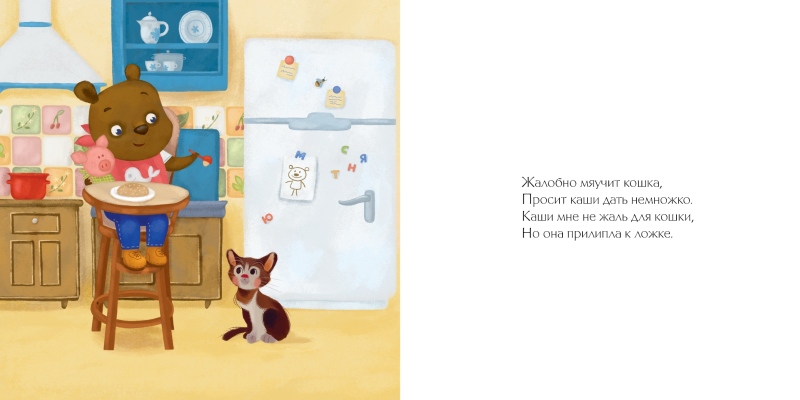 Красочные страницы новой книги «Медвежонок Федя и каша» превратят чтение забавной книжки в веселое путешествие в гости к Феде. Истории о Феде очень понравится детям в возрасте от 1 года до 3 лет. А плотные страницы прослужат не одному поколению веселых непосед! И на заметку родителям – эту книжку для развивающей игры «найди и покажи». Предложите ребёнку найти на странице те или иные предметы, попросите их посчитать, назвать цвета.