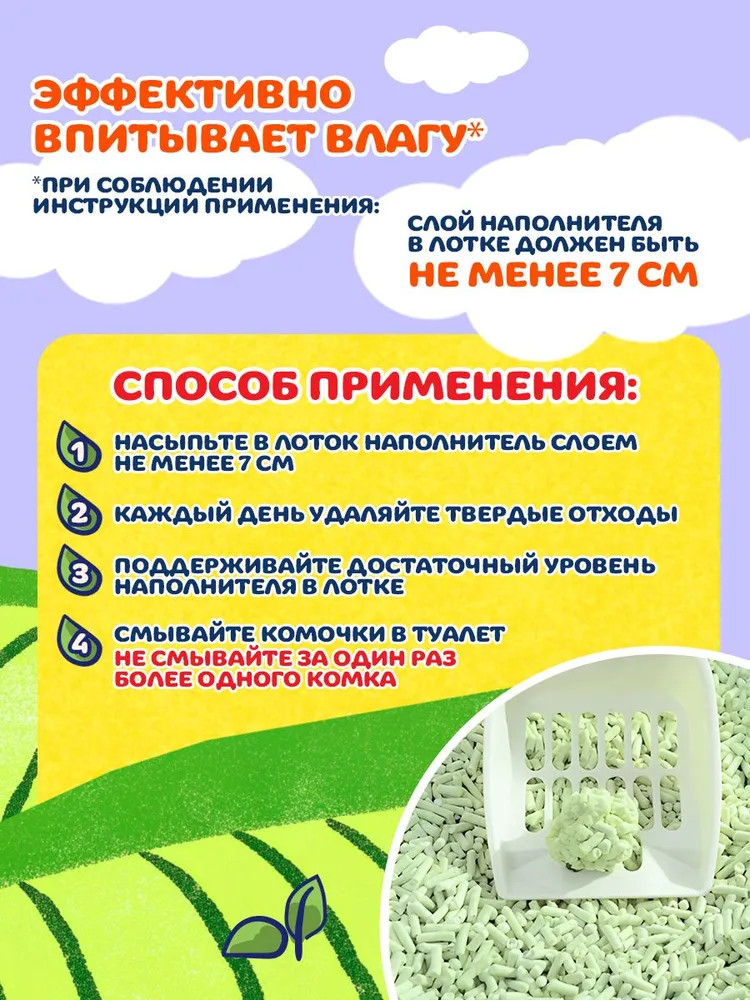 • эффективность: быстро впитывает жидкость и образует крепкие комки, что упрощает уборку лотка;