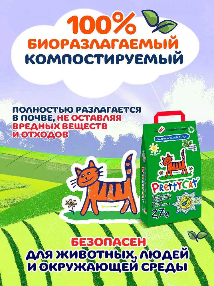 Комкующийся биоразлагаемый наполнитель для кошачьего туалета от Prettycat из соевых волокон с ароматом «Зеленый чай» — это идеальное решение для заботливых хозяев. Подходит для всех типов лотков и контейнеров, обеспечивая комфорт вашему питомцу и чистоту в помещении. Его можно утилизировать несколькими способами: в унитаз, выбросить в мусорный контейнер или компостировать. Выбирая соевый наполнитель от Prettycat, вы заботитесь о здоровье своего питомца и окружающей среды.