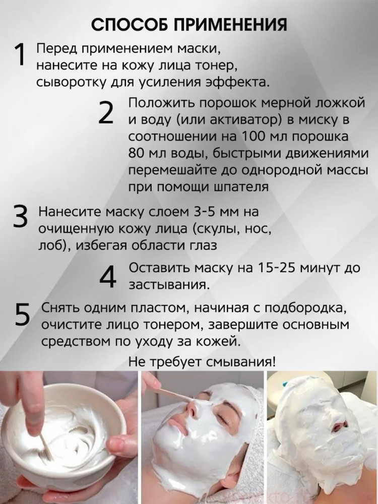 Маска очень классная, пробовала очень много разных, но эффекта от них было ноль, почитав отзывы, решила попробовать именно эту. После процедуры, лицо свежее, мелкие морщинки разглажены. Плюс, у меня бывает аллергия на некоторые крема и маски, данная маска аллергию не вызвала. Перед нанесением маски, желательно нанести сыворотку либо крем, для усиления эффекта. Важный момент, все, кто пишет, что маска не снимается! Девочки, вы ее слишком жидко развели, либо слишком тонкий слой нанесли! У меня первые 2 раза тоже не получилось, пришлось снимать кусками. Вчера я попробовала нанести толстым слоем примерно в 5 мм, и о чудо, маска снялась цельным куском! Так что, все дело в правильности нанесения. Однозначно, рекомендую и буду заказывать уже большую банку.