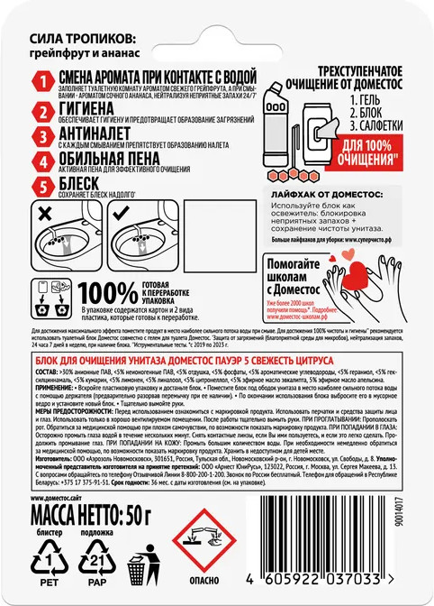 Шарики для унитаза — это эффективное решение для поддержания чистоты и свежести в вашем туалете. Уникальный сменный блок-ароматизатор заполняет туалетную комнату ароматом свежего грейпфрута, а при смывании — запахом сочного тропического ананаса. Подвесной блок для унитаза нейтрализует неприятные запахи 24/7, обеспечивая комфорт и гигиену.