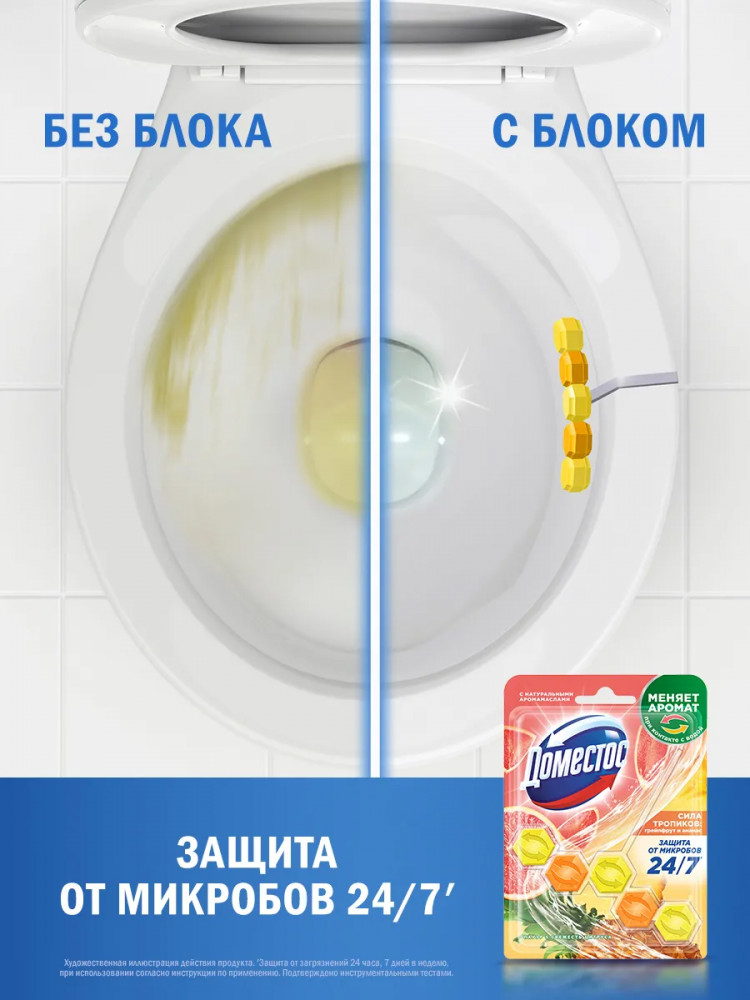 Таблетки для туалета Доместос помогут вам предотвратить образование известкового налета. Обильная пена, образующаяся при использовании средства, гарантирует эффективное очищение и сохранение блеска унитаза. В состав шариков входят натуральные аромамасла, которые не только освежают воздух, но и обеспечивают защиту от микробов. Это позволяет предотвратить их размножение, что важно для поддержания гигиены туалетной комнаты.