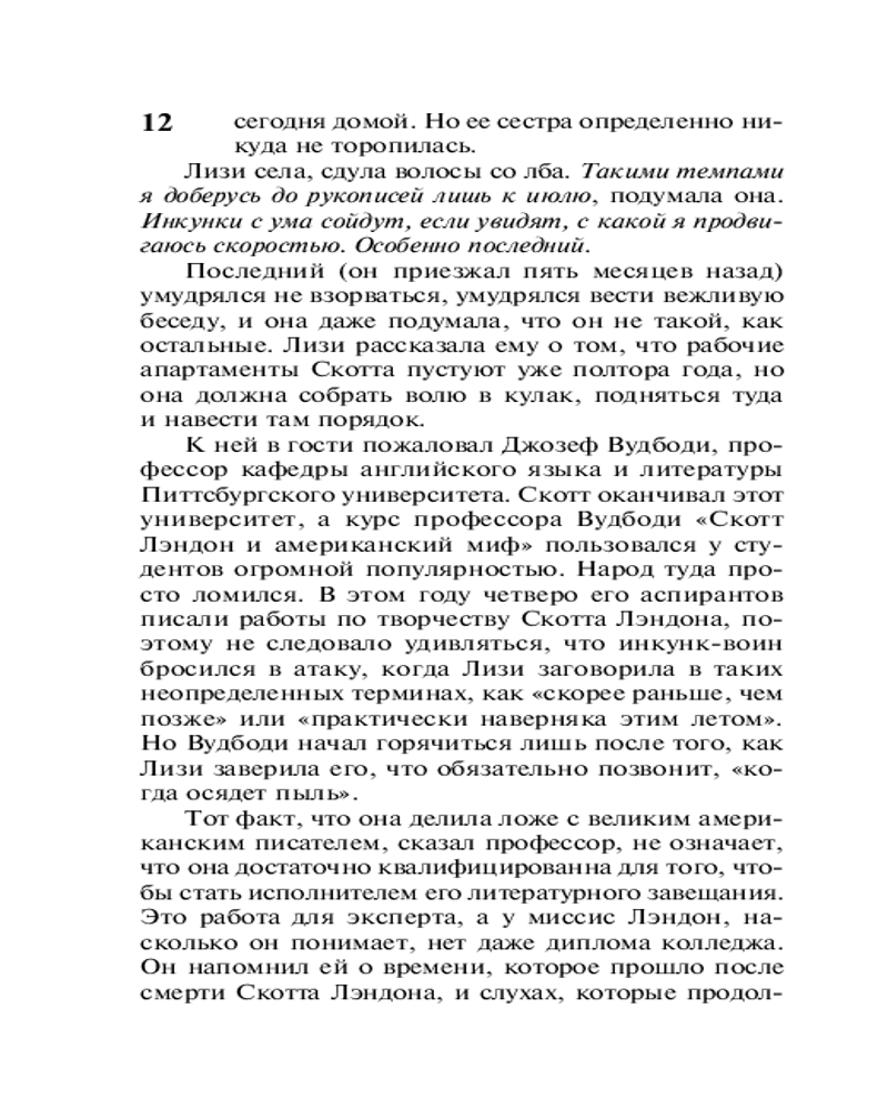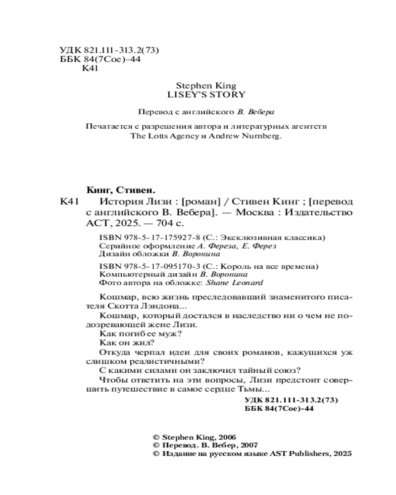 💳 Оплатить за товар можно при получении 🇰🇿 Есть бесплатная доставка по Казахстану 🎁 Копите бонусы с каждой покупки Серия: Эксклюзивная классика Кошмар, всю жизнь преследовавший знаменитого писателя Скотта Лэндона... Кошмар, который достался в наследство ни о чем не подозревающей жене Лизи. Как погиб ее муж? Как он жил? Откуда он черпал идеи для своих романов, кажущихся уж слишком реалистичными? С какими силами он заключил тайный союз? Чтобы ответить на эти вопросы, Лизи предстоит совершить путешествие в самое сердце Тьмы... |