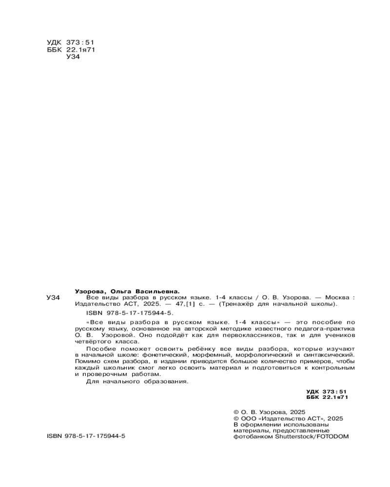 💳 Оплатить за товар можно при получении 🇰🇿 Есть бесплатная доставка по Казахстану от 1 дня 🎁 Копите бонусы с каждой покупки Серия: Тренажер для начальной школы «Все виды разбора в русском языке. 1-4 классы» — это пособие по русскому языку, основанное на авторской методике известного педагога-практика О. В. Узоровой. Оно подойдёт как для первоклассников, так и для учеников четвёртого класса. Пособие поможет освоить ребёнку все виды разбора, которые изучают в начальной школе: фонетический, морфемный, морфологический и синтаксический. Помимо схем разбора, в издании приводится большое количество примеров, чтобы каждый школьник смог легко освоить материал и подготовиться к контрольным и проверочным работам. Для начального образования. |