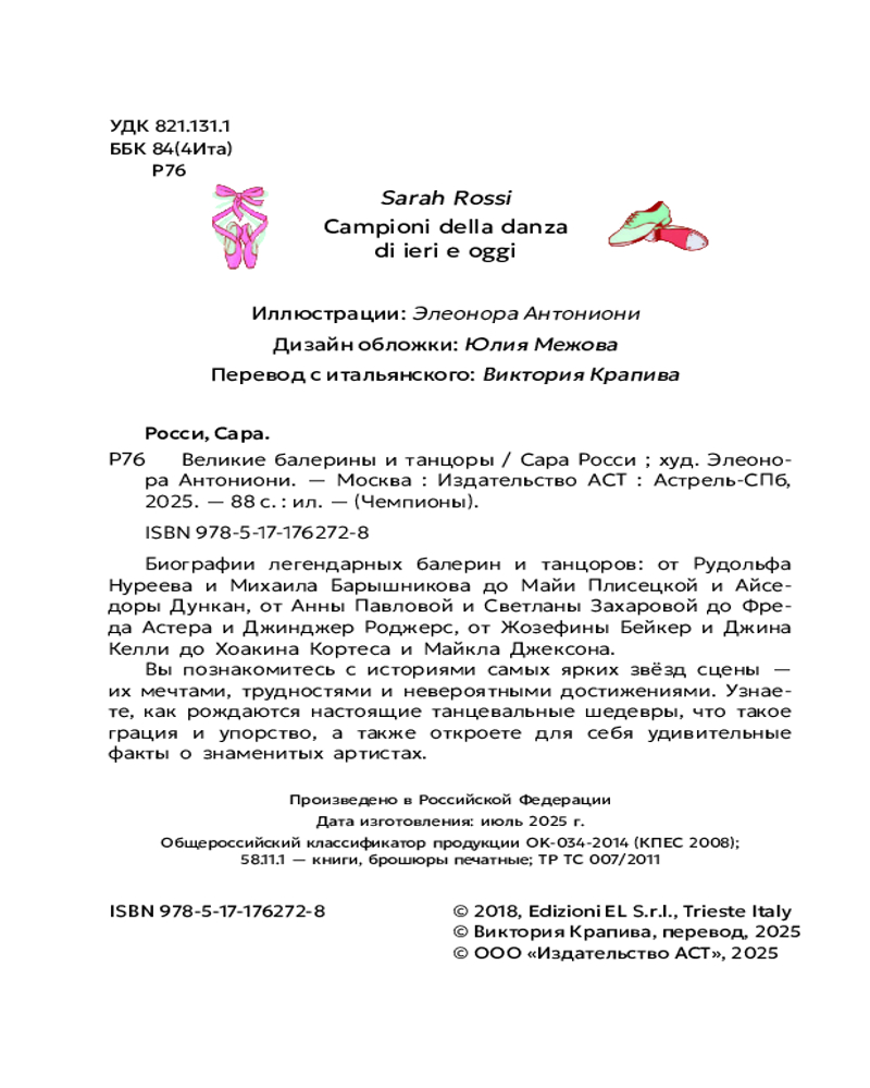 💳 Оплатить за товар можно при получении 🇰🇿 Есть бесплатная доставка по Казахстану от 1 дня 🎁 Копите бонусы с каждой покупки Серия: Чемпионы Биографии легендарных балерин и танцоров: от Рудольфа Нуреева и Михаила Барышникова до Майи Плисецкой и Айседоры Дункан, от Анны Павловой и Светланы Захаровой до Фреда Астера и Джинджер Роджерс, от Жозефины Бейкер и Джина Келли до Хоакина Кортеса и Майкла Джексона. Вы познакомитесь с историями самых ярких звёзд сцены — их мечтами, трудностями и невероятными достижениями. Узнаете, как рождаются настоящие танцевальные шедевры, что такое грация и упорство, а также откроете для себя удивительные факты о знаменитых артистах. |